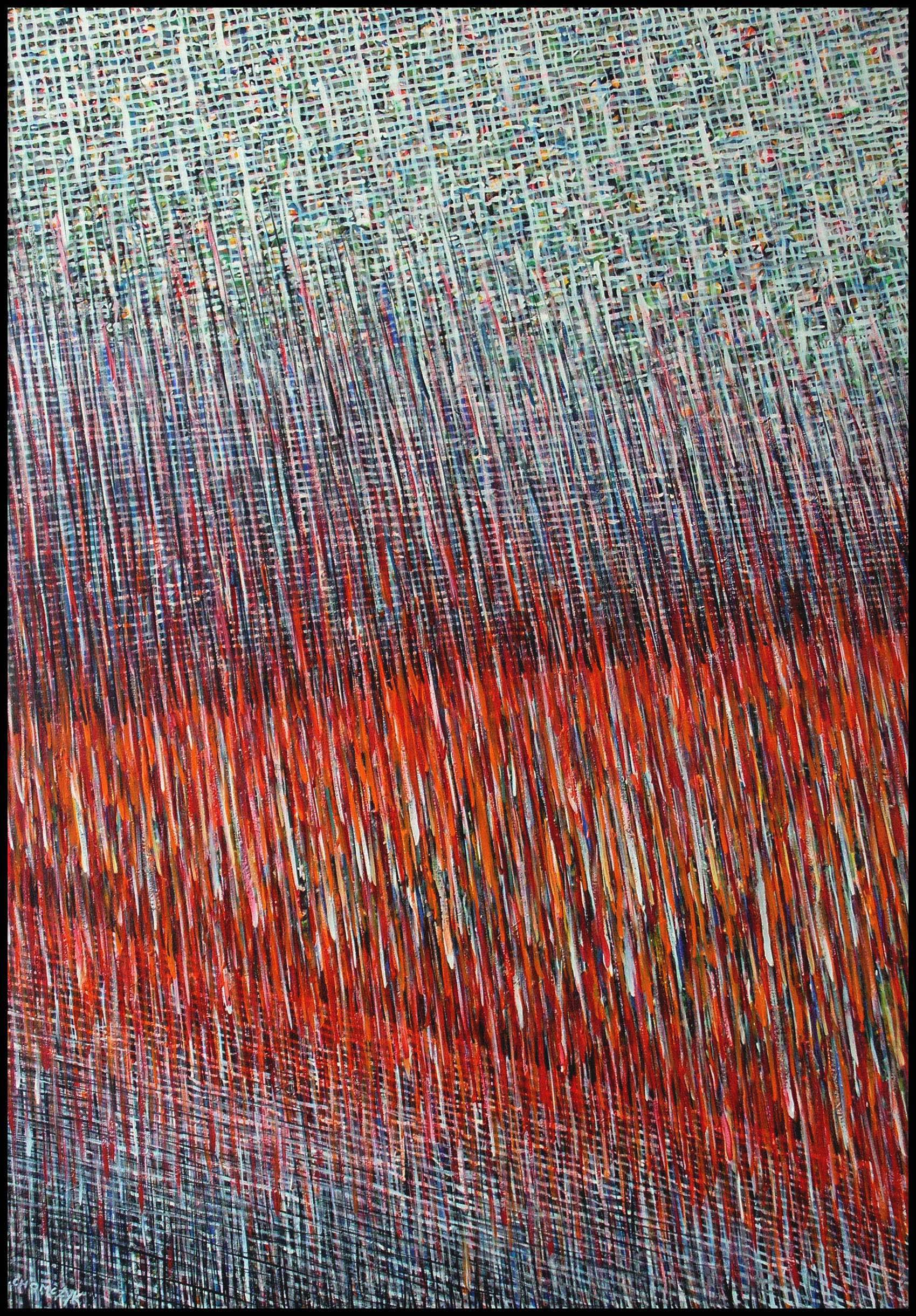 Obraz emanuje intensywnością kolorów i dynamiczną kompozycją. Pionowe linie, przechodzące od chłodnych, niebieskawych tonów u góry, poprzez gorące czerwienie i pomarańcze, aż po ciemne, głębokie barwy na dole, tworzą wrażenie ruchu. Całość wygląda jak wizualny taniec, który zatrzymał się na płótnie. Wydaje się, że każda linia jest jak kropla deszczu, spływająca po szybkim, chaotycznym deszczu. Atmosfera jest burzliwa i pełna energii. Obraz wyzwala uczucie lekkiego niepokoju, jakby coś wielkiego miało się wydarzyć. Styl malarski przypomina abstrakcyjny ekspresjonizm, w którym emocje mają pierwszeństwo przed formą. Technika warstwowego nakładania farby tworzy głębokość i teksturę, zachęcając oko do odkrywania każdego detalu. Obraz może wywoływać różne emocje. Dla jednych to chaos, dla innych harmonia kolorów. Jest jak kalejdoskop, który z każdym spojrzeniem odkrywa coś nowego. Wow, ale to wygląda jak gorące płomienie! Dziecięca wyobraźnia może widzieć tu kaskadę spadających liści jesienią. To artystyczne "rush" porywa nas w podróż do wnętrza emocji. Moje pierwsze wrażenie to zachwyt nad dynamiką i rozmachem dzieła. Obraz mówi dynamiką i siłą koloru, niekoniecznie słowami. Przez jego intensywność można odczuć nie tylko piękno, ale i pewną surowość chwili. Patrząc na to dzieło, można poczuć falę energii, która podąża za każdym pociągnięciem pędzla.