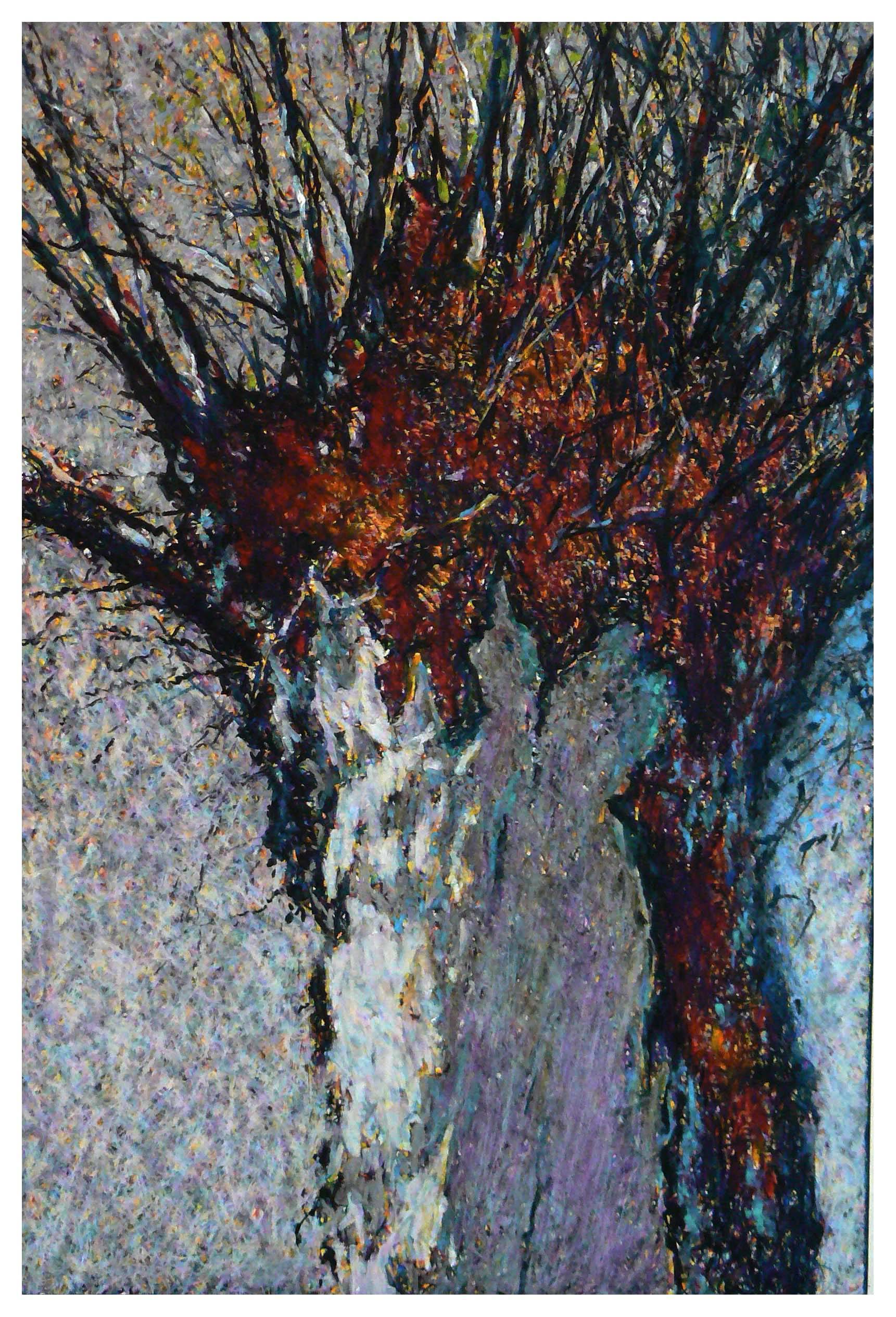 Obraz tętni życiem i dynamiką. Główne elementy to krzątanina gałęzi drzewa, które zdają się eksplodować z centralnego punktu. Dominują ciemne brązy, czernie, przeplatane ciepłymi odcieniami pomarańczy i czerwieni. Tło tworzy delikatną mgiełkę z chłodnych szarości i fioletów. Nastrój dzieła jest nieco tajemniczy i powściągliwy, jakby zapraszał nas do zanurzenia się w jego głąb. Styl malarski pokazuje śmiałe pociągnięcia, niemal impasto, które dodają teksturę i ożywiają korę drzewa. Wygląda jakby drzewo miało włosy, mamo! Artysta zastosował dynamiczne pociągnięcia pędzlem, co nadaje całej scenie wrażenie ruchu. Dla mnie obraz emanuje siłą natury, spontanicznością i nieokiełznaną energią. Może kojarzyć się z początkiem burzy lub chwilą tuż przed wschodem słońca. Obraz skłania do refleksji nad siłą przyrody i naszą rolą w niej. To jest takie "wow" dla każdego, kto lubi sztukę, która pobudza do myślenia.