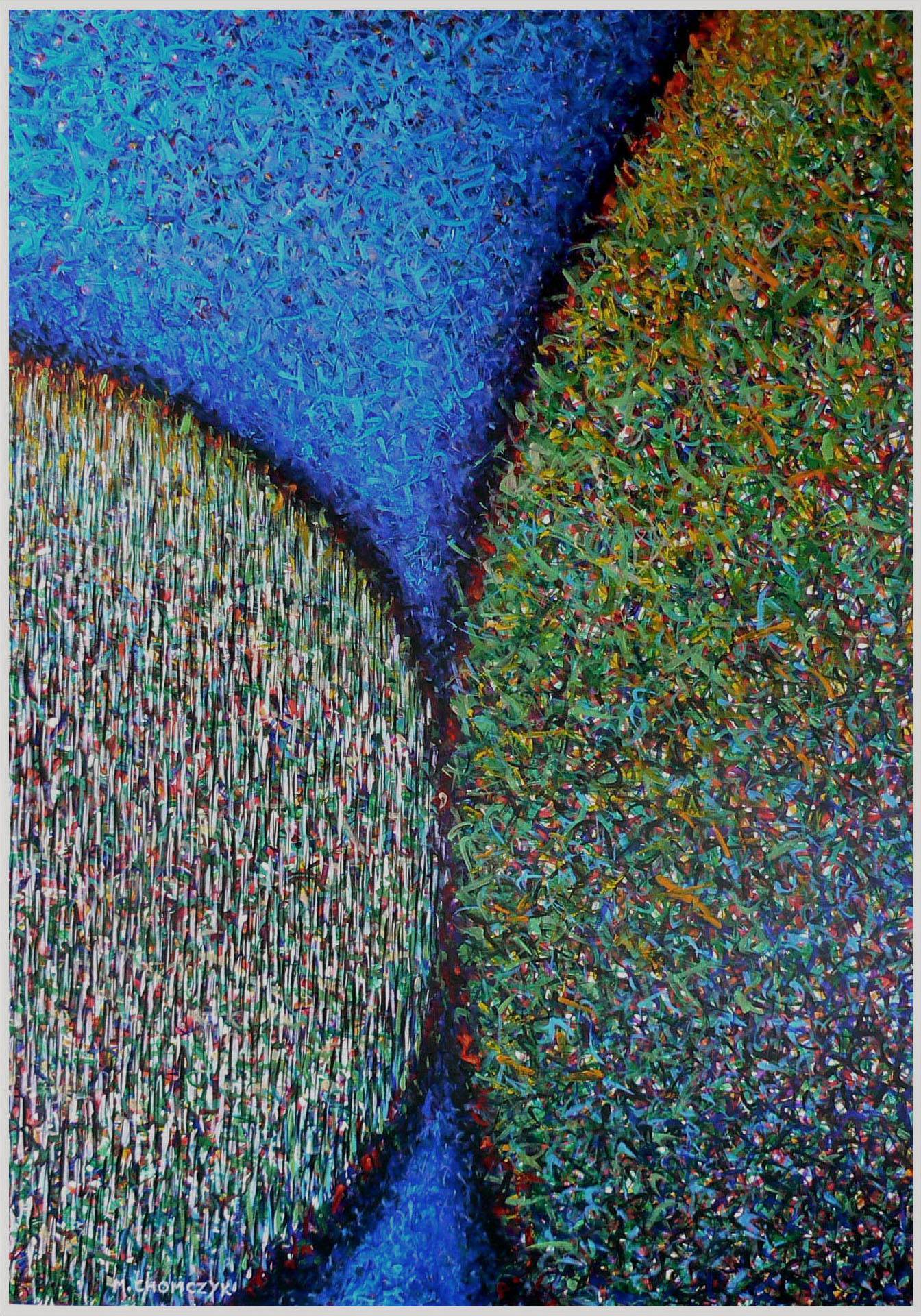 Obraz jest istną eksplozją kolorów. Dominują tu intensywne odcienie niebieskiego i zielonego, a między nimi można dostrzec subtelne przejścia w postaci mocniejszych akcentów czerwieni i bieli. Kompozycja wydaje się być przemyślanie chaotyczna, jakby artysta chciał uchwycić moment napięcia między harmonią a nieporządkiem. Nastrój dzieła jest dynamiczny i pełen energii. Czuję, że zanurzam się w świat pełen ruchu i wibracji. Technika użyta przez artystę sugeruje impasto, co można zauważyć w głębokości kolorów i teksturze warstw farby. Pociągnięcia pędzlem są krótkie, a jednak precyzyjne jakby miał miejsce magnes pod powierzchnią płótna przyciągający wszystkie elementy do środka. Obraz wydobywa emocje takie jak spokój przeplatający się z ekscytacją, jak podczas deszczowego dnia, gdy dzieci wracają do domu przez kałuże. "I love colors!" - wykrzyczałoby dziecko patrząc na ten obraz. Można odnieść wrażenie, że dzieło komunikuje cykl natury lub proces tworzenia. Dla mnie osobiście to trochę jakby artysta chciał opowiedzieć historię o rosnącej trawie pod bezkresem nieba. Całość emanuje feeling nieustannych zmian i transformacji, co skłania do refleksji nad codziennością.