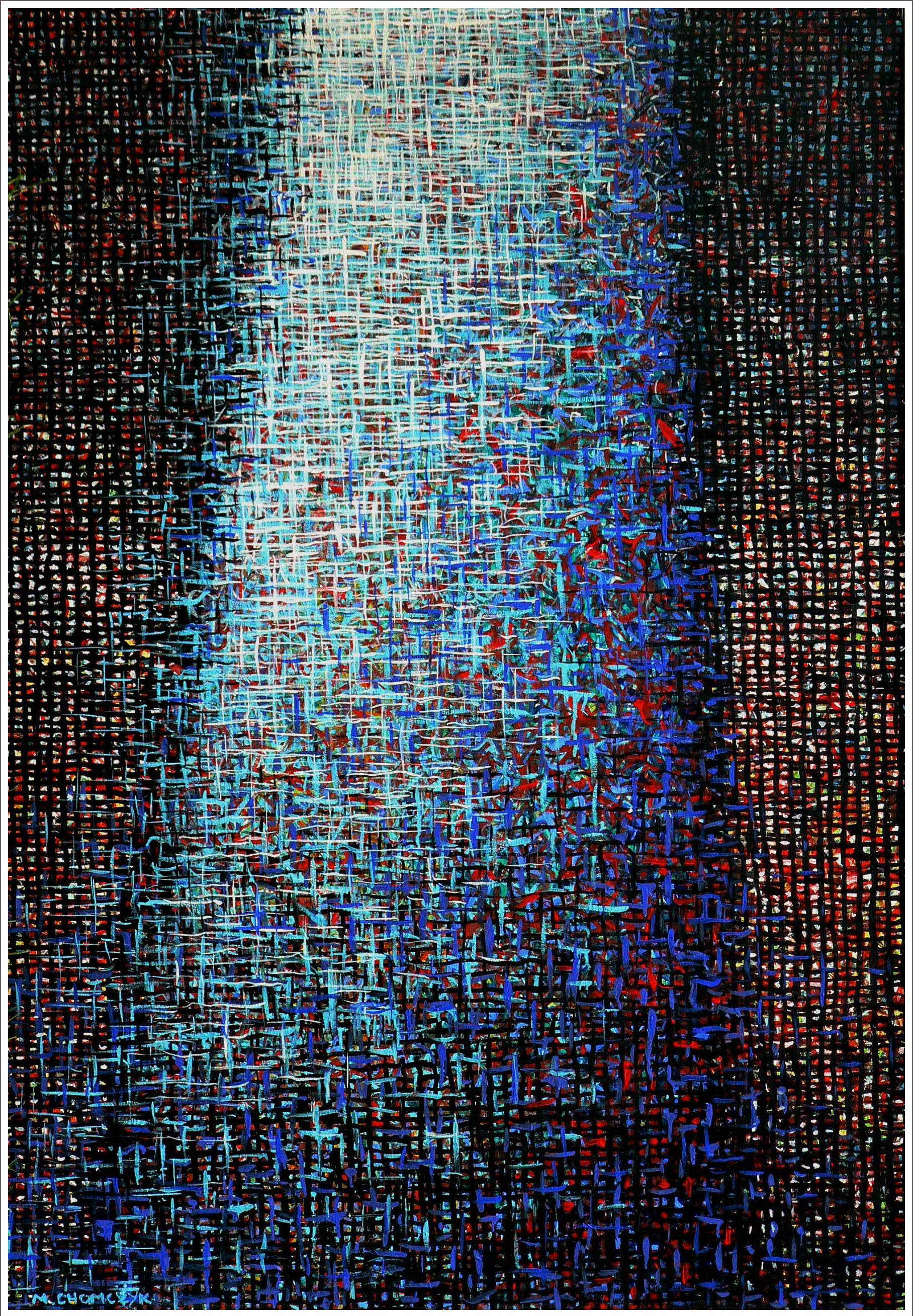 Obraz emanuje złożoną, niemal hipnotyczną aurą dzięki swojej wyjątkowej kompozycji. Przewaga chłodnego błękitu i nasyconych granatów tworzy iluzję przestrzeni zanurzonej w tajemniczym świecie. W centrum znajduje się jasna kolumna światła, przyciągająca wzrok jak światło latarni w ciemności. Kształty, które przypominają misterne linie splecione w gęstą sieć, wywołują uczucie dynamiki i rytmu. Artysta zastosował technikę impasto, co nadaje dziecięcej prostoty nawet najdrobniejszym pociągnięciom pędzla. Widząc tę paletę barw i techniczne mistrzostwo, można poczuć się jakby się wkraczało do świata "fantasy". Styl dzieła, będący połączeniem abstrakcji i modernizmu, skłania do refleksji nad nieuchwytną naturą światła i cienia. Może ono wywołać u odbiorcy poczucie zagubienia, ale i spokojnej medytacji. Patrząc na to, myślę: Wow, świat może być taki skomplikowany! Dzieło wysyła zaproszenie do odkrywania, do poszukiwań tego, co ukryte za pierwszym wrażeniem. To obraz, który nie da o sobie zapomnieć.