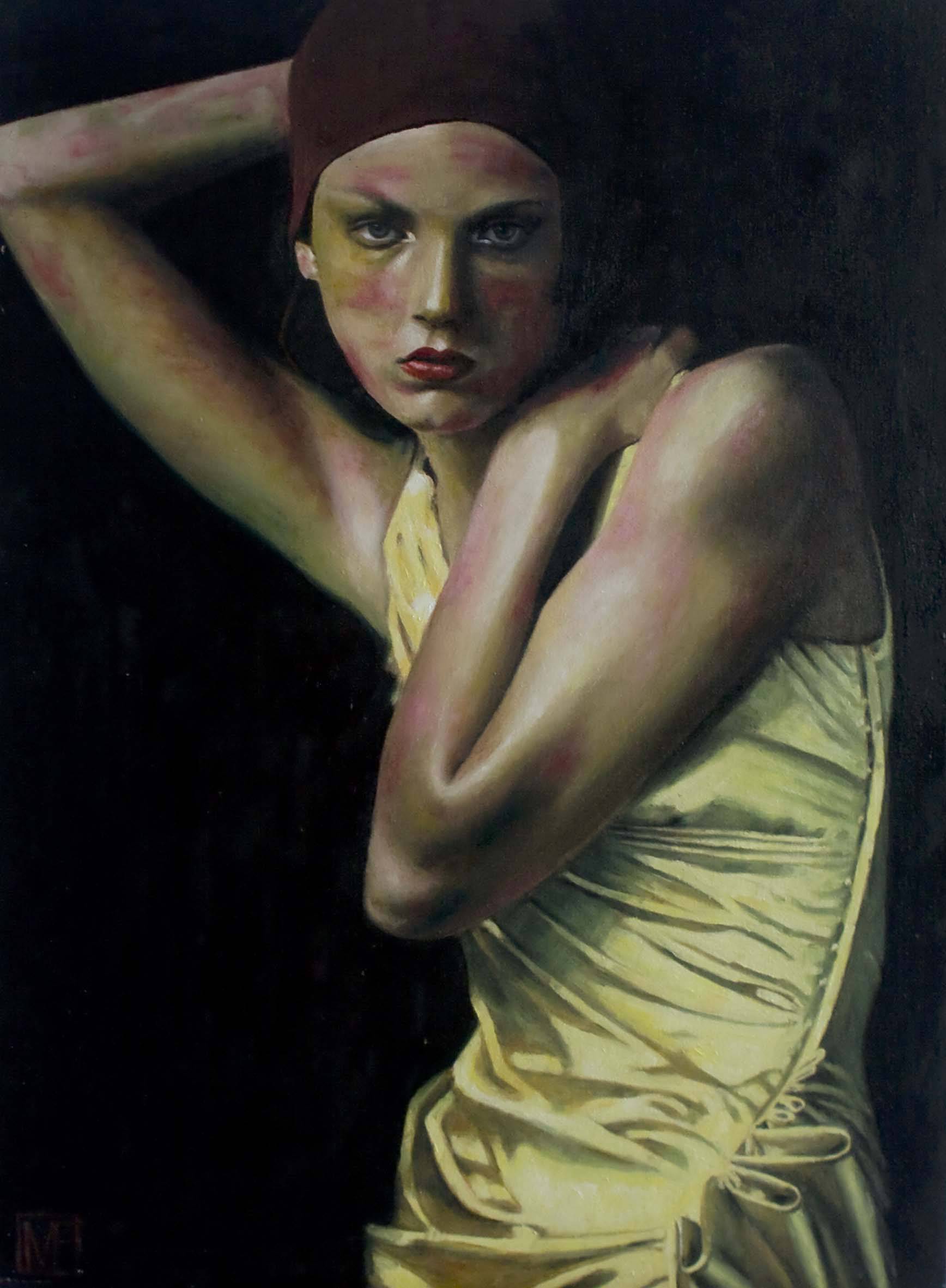 Obraz przedstawia postać zanurzoną w głęboko nasyconych barwach, które niemal hipnotyzują. Ciemne tło uwydatnia jasną skórę postaci, kontrastując z żółtą sukienką, której materiał zdaje się marszczyć w dramatyczny sposób. Wzrok kobiety, pełen intensywności, przyciąga jak magnes i sprawia, że czujesz jej obecność. Kompozycja jest klasyczna, z elegancją, która jednocześnie bawi się dynamicznymi liniami i subtelnymi cieniami. Atmosfera tego obrazu jest nieco tajemnicza, może nawet melancholijna. Wydaje się szeptać historie z przeszłości lub snuć opowieści o nieznanym. Styl malarski cechuje się realizmem z nutką wyrafinowanego ekspresjonizmu. Artysta zastosował delikatne pociągnięcia pędzla, które nadają postaci życia, prawie jakby zaraz miała ożyć i przemówić. Obraz może wywołać u widza różnorodne emocje. Od odczucia niepokoju po podziw dla kunsztu. To dzieło, które można by nazwać "intriguing". Patrząc na nie, miałoby się ochotę porozmawiać z tą postacią, zapytać, co myśli, co czuje. Możliwości interpretacji są nieograniczone i mogą prowadzić do osobistych refleksji. Jak dziecko powiedziałoby: "Fajna sukienka, ale wygląda smutno". Osobiście, patrząc na ten obraz, czuję jakąś niesamowitą więź z nieznaną osobą. Czeka na odkrycie, na zrozumienie. Może dlatego właśnie tak fascynuje. Każdy detal przyciąga uwagę i sprawia, że chce się go oglądać raz jeszcze, by odkryć coś nowego, coś więcej. To sztuka, która mówi do nas, nawet jeśli robi to w ciszy.