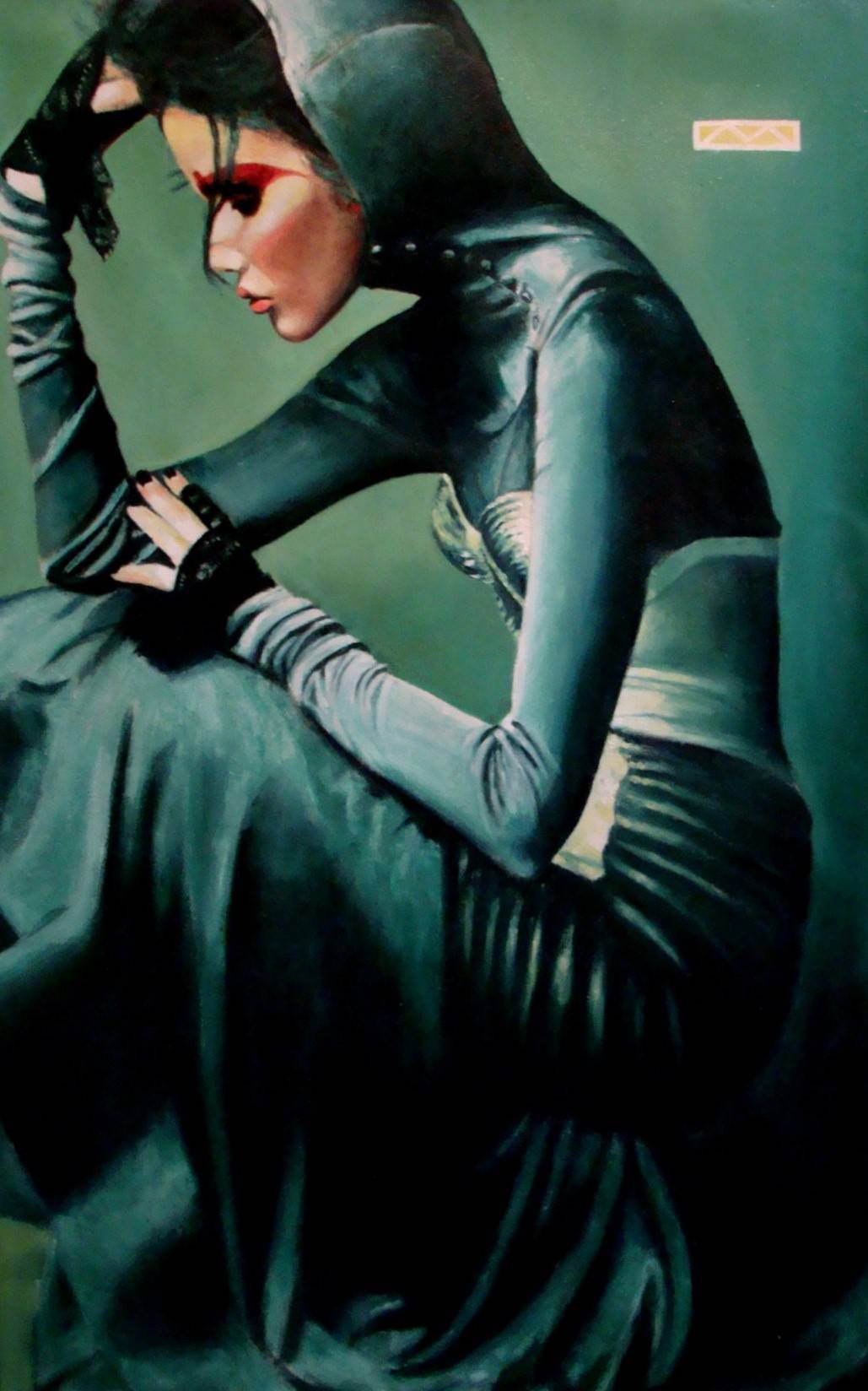 Na obrazie widzimy zamyśloną postać kobiety, która siedzi w pozycji skulenia, pogrążona w swoich myślach. Kolory to głównie odcienie zieleni, które dominują w tle i ubraniu postaci, co nadaje całości tajemniczy i melancholijny nastrój. Kompozycja skupia się na kobiecie, której subtelna uroda przyciąga wzrok. Jej twarz jest oświetlona z boku, co tworzy ciekawy kontrast i podkreśla delikatne rysy. Styl obrazu jest realistyczny, choć widać wpływy impresjonizmu w zastosowaniu światła i cieni. Artysta zastosował techniki olejne, co widać po delikatnych przejściach między kolorami i fakturą materiału, który jakby miękko otula postać. Obraz wywołuje w odbiorcy uczucie zadumy, może nawet smutku. Można się zastanawiać, o czym myśli ta kobieta. Czy tęskni za czymś, co utraciła? Może to chwila refleksji nad życiem. Obraz stwarza "mood" jak z marzeń, taki nostalgic. Dla mnie ten obraz jest jak tajemnicza opowieść, która rozwiewa się jak mgła. A co by powiedział siedmiolatek? "Pani siedzi i myśli o czymś smutnym." Takie proste i szczere. W ten sposób obraz skłania mnie do refleksji nad ulotnością chwil. To jeden z tych momentów, kiedy sztuka mówi więcej niż tysiąc słów. I zostawia nas z naszymi myślami.