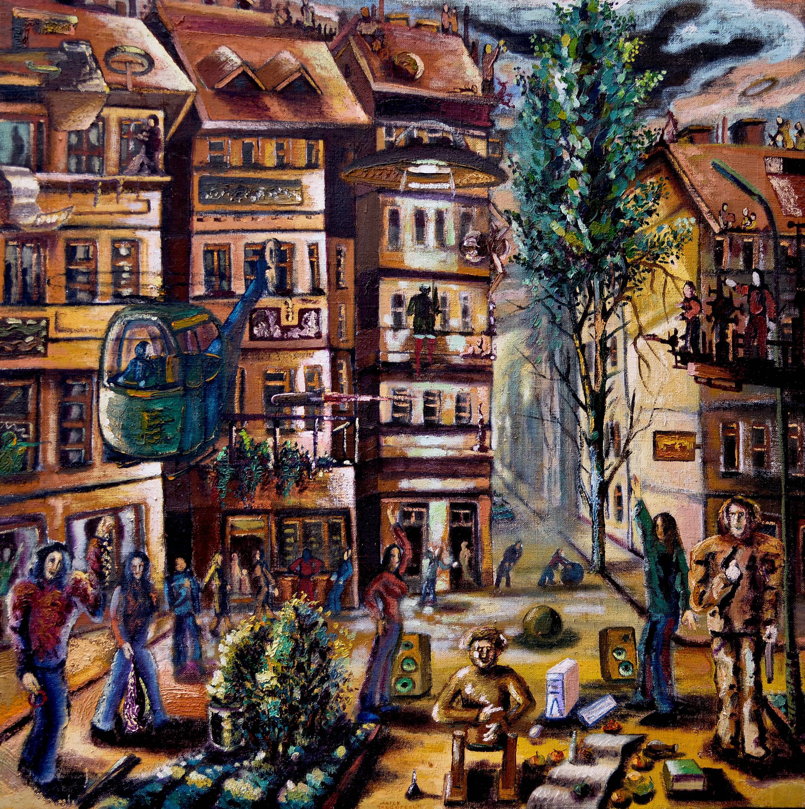 Na obrazie widzimy zatłoczone miasto pełne życia i niespodzianek. Bogactwo ciepłych barw, takich jak brązy i złote odcienie, kontrastuje z chłodnymi błękitami. Kształty budynków są dynamiczne, pełne zakrzywień i detali, co nadaje kompozycji pewną bajkową jakość. Atmosfera jest pełna życia; czuć gwar i ruch, jakby miasto nigdy nie zasypiało. Artysta używa techniki bardzo ekspresyjnej. Pociągnięcia pędzla są śmiałe i żywiołowe, co dodaje obrazowi energii i rytmu. Na obrazie widać ludzi zamyślonych, a jednocześnie zaaferowanych codziennością. Można sobie wyobrazić, jak ktoś mógłby powiedzieć: "Też chciałbym być tam!". Dzieci, grające na podwórku, przyszłość, która powoli odkrywa przed nimi swoje tajemnice. Obraz przywodzi na myśl refleksję nad tempem współczesnego życia miejskiego. Jest to dzieło, które porusza i zmusza do zastanowienia się nad ludzkimi relacjami. I nagle - booming głośniki! To takie miejskie disco, które wszyscy czują. Całość wydaje się jednocześnie chaotyczna i zharmonizowana, tak jak nasze życie, pełne kontrastów i piękna ukrytego w codzienności.
