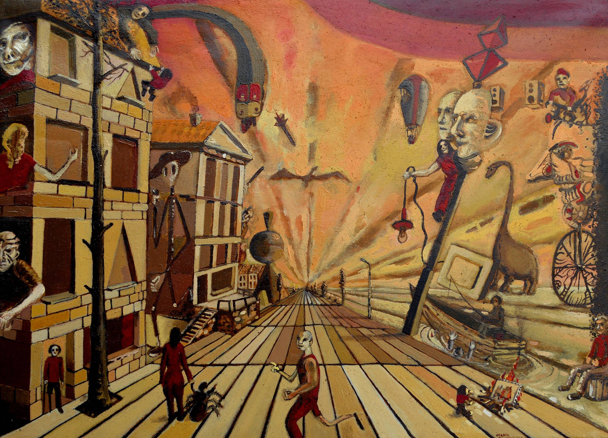 Obraz to prawdziwe szaleństwo barw i form, które przyciąga wzrok. Dominuje pomarańczowe niebo, które zdaje się wpadać w różowe tony, przeszyte dynamicznymi liniami prowadzącymi ku horyzontowi. Na pierwszym planie widać budynki o geometrycznych kształtach, z postaciami, które wyglądają jak wyjęte z marzeń sennych. Ludzie o zdeformowanych proporcjach, dziwnie naciągnięci, jakby lampki. Wśród nich dostrzec można dziwaczne zwierzę kwiat z ludzkimi twarzami. Atmosfera obrazu jest surrealistyczna i niepokojąca. Wszystko wydaje się iść w kierunku nieznanego. Styl artystyczny przypomina twórczość awangardową, z mocnym nawiązaniem do surrealizmu. Technika może wskazywać na użycie grubych pociągnięć pędzla, które dodają głębi i tekstury. Ten obraz może wywoływać różne emocje. Dla jednych będzie to dziwna podróż w świat wyobraźni, dla innych przerażający koszmar. Wow, ten obraz jest jak trochę straszny sen! Może zainspirować do głębokich refleksji na temat rzeczywistości i snu. "Mind-blowing", powiedziałby ktoś patrząc na to dzieło. Czuć tu energię nierzeczywistości mieszającą się z codziennością, co sprawia, że trudno oderwać wzrok.