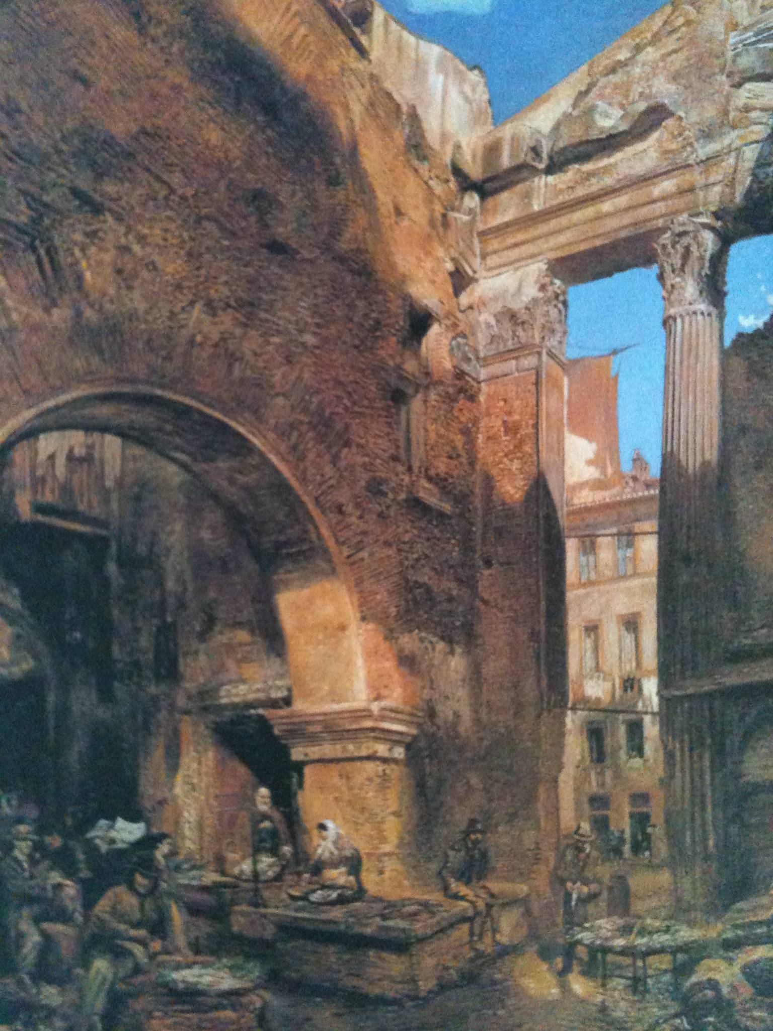Obraz emanuje nostalgią starożytności, ukazując ruiny o ciepłych, ziemistych kolorach z przewagą zgaszonego brązu i rudości. Pod niezwykle błękitnym niebem widać monumentalne kolumny i łuki, które wprowadzają widza w pradawny świat pełen tajemnic. Kompozycja dzieła przyciąga wzrok ku centrum, gdzie nieliczni mieszkańcy zdają się ożywiać starożytne mury. Atmosfera jest przyjemnie spokojna, jednocześnie pełna nieopisanej historii, którą można tylko wyczuć, ale nie dosłyszeć. Artysta z mistrzowską precyzją uchwycił tekstury i detale murów, stosując subtelne pociągnięcia pędzla i bogatą paletę kolorów. Ciekawą techniką jest wykorzystanie światłocienia, który podkreśla grę słońca na surowych ścianach. Obraz może wzbudzać w odbiorcy poczucie melancholii, a może i refleksję nad przemijaniem czasu. Tak jak stare pocztówki, które ktoś dawno temu wysłał na pamiątkę. Trochę smutno, ale też magicznie. To miejsce wygląda jak adventure, czuje się jakby w każdej chwili miało się tam coś zdarzyć. Are you feeling intrigued yet? Dzięki swobodnemu stylowi dzieło staje się bardziej przystępne i przyjemne w odbiorze, wzbudzając jednocześnie chęć zgłębiania historii, którą te ściany mogłyby opowiedzieć.