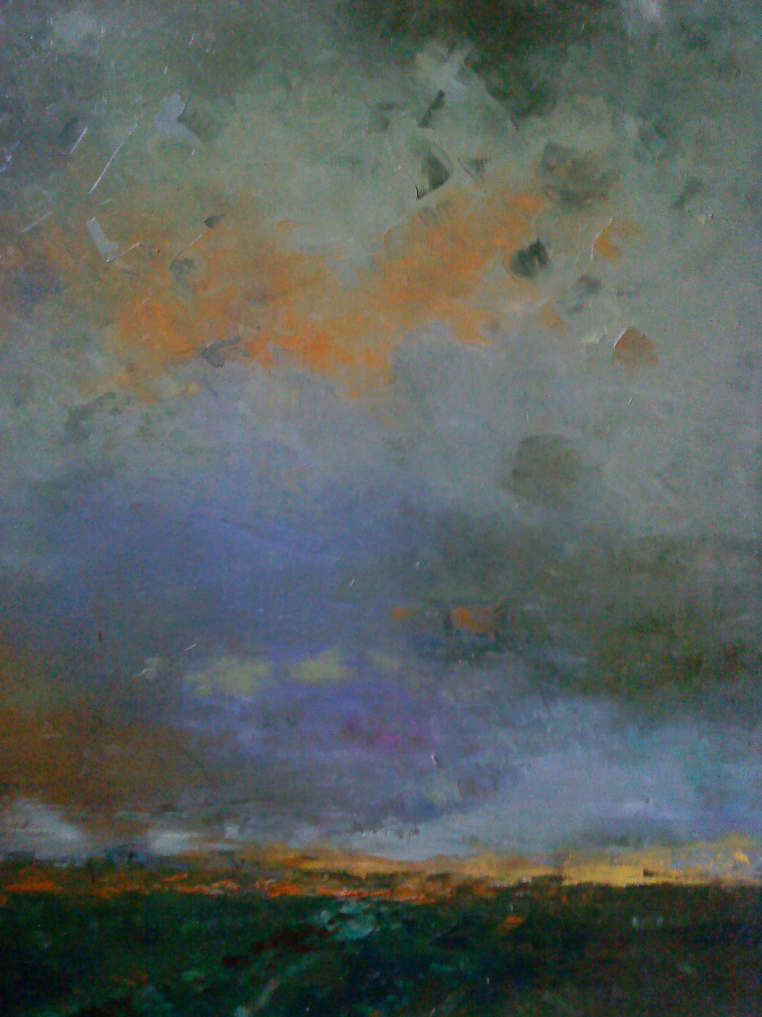 Obraz emanuje niezwykłą atmosferą spokoju, a jednocześnie tajemniczości. Dominują tu różne odcienie szarości, zieleni i pomarańczu, które splatają się niczym chmury o świcie. Kolory te tworzą harmonijną, choć nieco burzową kompozycję, gdzie niebo zdaje się być tak blisko ziemi. Kształty są zamglone, rozmyte, co dodaje całości nieco surrealistycznego charakteru. Technika zastosowana przez artystę przypomina impresjonizm z nutką abstrakcji. Pociągnięcia pędzla są dynamiczne, co dodaje głębi i tekstury. Można poczuć, jakby obraz wręcz oddychał, tętnił życiem. Taki pejzaż nastrojowy sprawia, że na chwilę zatrzymujesz się i patrzysz na niego, zastanawiając się nad przemijaniem czasu. Co ciekawe, z perspektywy dziecka: "To wygląda jak bajkowe niebo, które zmienia kolory, kiedy jest smutne!" Obraz wywołuje emocje, takie jak nostalgia i refleksja nad przyrodą. Jednym słowem, zupełnie mesmerizing. Moim zdaniem, mógłby być tłem do jakiejś pięknej, romantycznej opowieści.