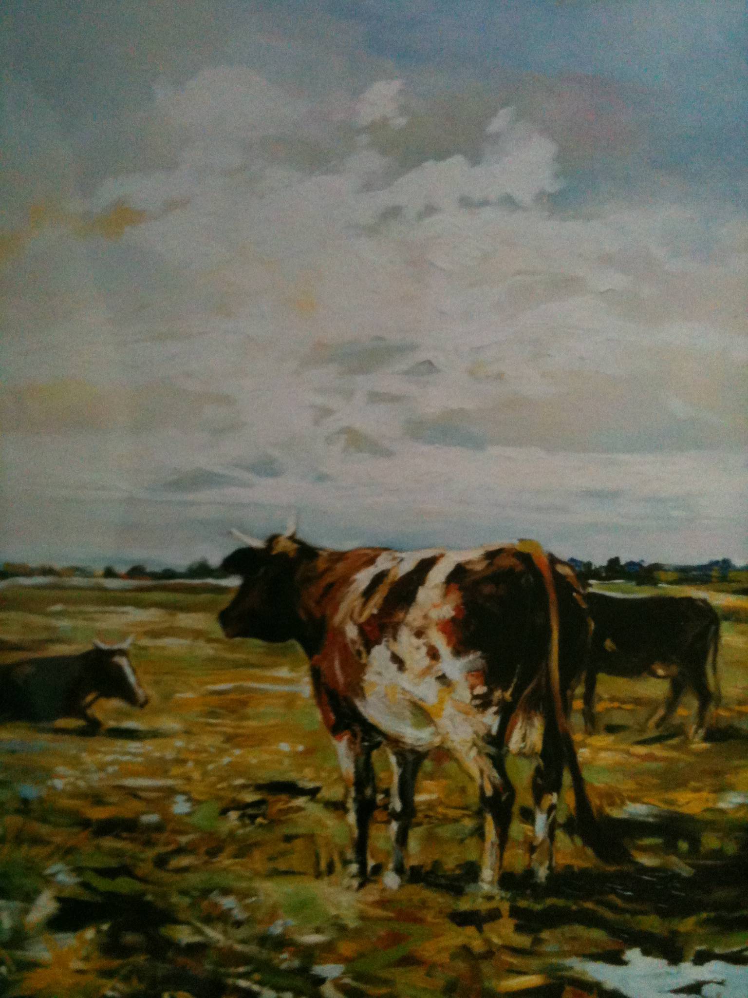 Na obrazie widzimy kilka krów na rozległej łące. Dominują tu ciepłe, ziemiste barwy, kontrastujące z błękitem nieba i miękkimi obłokami. Krajobraz jest dynamiczny, pełen ruchu i życia, mimo że same zwierzęta stoją nieruchomo. Kompozycja skupia się na centralnej krowie, której brązowo-biała sierść jest pięknie uwypuklona przez światło. Technika malarska, być może to olej na płótnie, jest swobodna, a pociągnięcia pędzla są widoczne, co dodaje obrazowi dynamiki i witalności. Jest tu coś z uroku wsi, coś, co wywołuje tęsknotę za prostotą życia na łonie natury. Nastrój jest sielski, wręcz idylliczny. Można niemal poczuć zapach trawy i usłyszeć ciche mruczenie krów. Takie obrazy przywodzą na myśl spokój i kontemplację natury. Patrząc na tę scenę, można złapać się na myśli: "Wish I were there", z dala od zgiełku miasta. Krowy wydają się niezachwiane, zupełnie jak strażnicy tej sielskiej krainy. Małe dziecko mogłoby powiedzieć: "O, krowy są takie duże i fajne!" Obraz emanuje ciepłem, a jego emocjonalny wydźwięk to połączenie zachwytu nad prostotą codziennego życia i chwili zatrzymanej w czasie. Refleksja, jaką może wywołać, to przemyślenia nad harmonią między człowiekiem a naturą. Takie momenty są jak maleńkie skarby schowane w naszej pamięci.