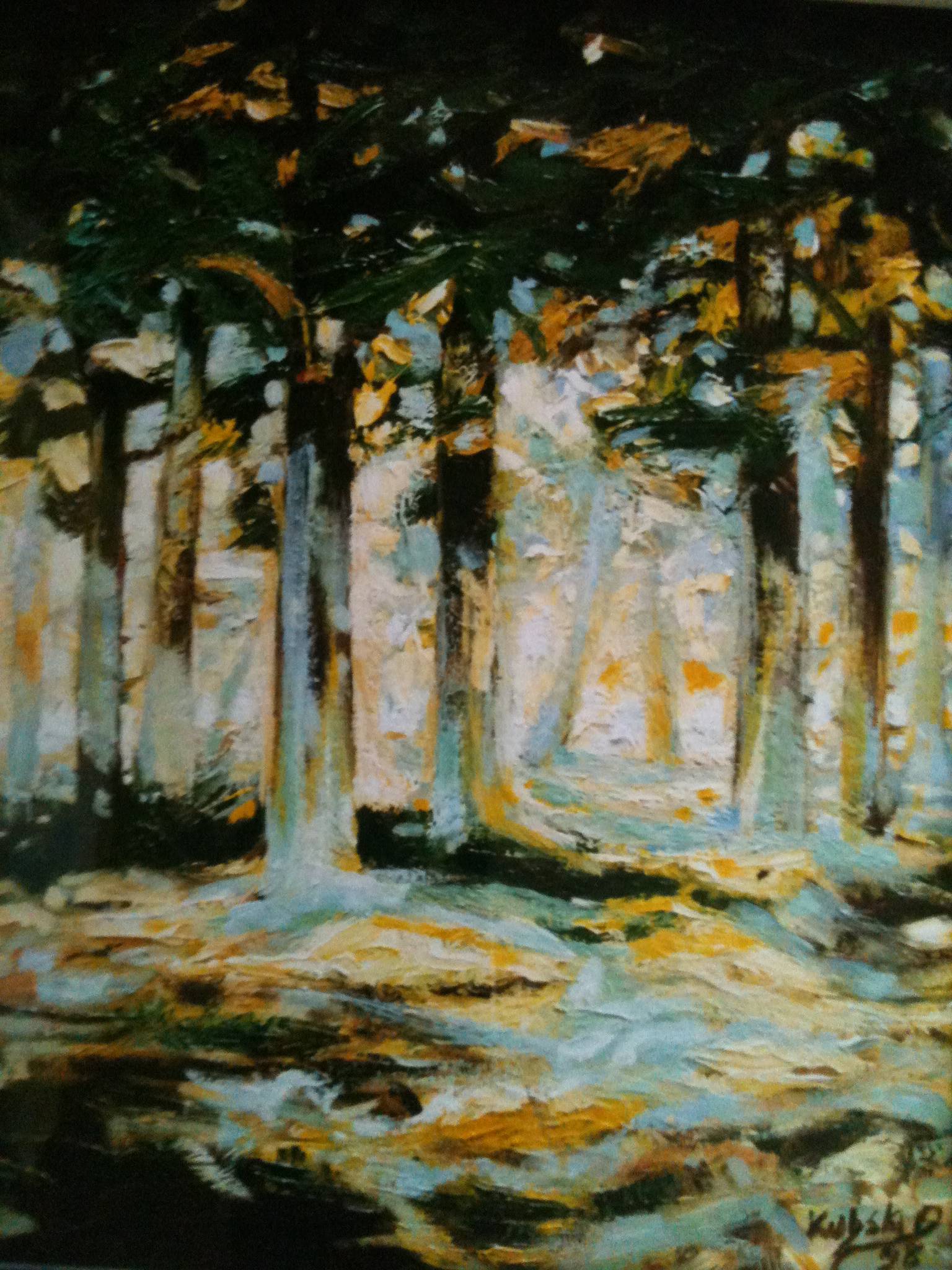Obraz przedstawia gęsty las, nasycony głębokimi kolorami zieleni i złota, które tworzą tajemniczą aurę. Wysokie drzewa zdają się tańczyć na wietrze, ich pnie wypełniają przestrzeń płótna, tworząc harmonijną kompozycję. Mimo, że paleta kolorystyczna jest ograniczona, kontrastujące barwy nadają obrazowi dynamiczność i głębokość. Artysta użył zdecydowanych pociągnięć pędzla, które dodają energii każdemu elementowi dzieła. Atmosfera obrazu przypomina spacer w chłodny jesienny poranek, gdzie promienie słońca przebijają się przez korony drzew, tworząc efekt "dappled light". To takie magiczne! Jest w tym coś nostalgicznego, co przywołuje wspomnienia spędzonych beztrosko chwil. Chociaż obraz jest statyczny, ma w sobie coś, co przyciąga uwagę – ciągle można odkrywać w nim nowe detale. Styl malarski to impresjonizm, pełen rozmytych kształtów i niedopowiedzeń, co nadaje obrazowi pewną lekkość. Krótkie, pospieszne pociągnięcia pędzla dodają wrażenia ruchu, zupełnie jakbyśmy zobaczyli migawkę z rzeczywistości. Technika ta sprawia, że obraz staje się "alive", niemalże słyszymy szelest liści i śpiew ptaków. Dzieło może budzić uczucia spokoju, ale też ciekawości – co kryje się za następnym drzewem? Pod wpływem obrazu widz może poczuć się zrelaksowany, zanurzony w świecie przyrody, oddalony od zgiełku codziennego życia. To jak mała escapade, chwila oddechu. Ale może też wywołać refleksję o pięknie otaczającego świata, który często umyka w codziennym pośpiechu.