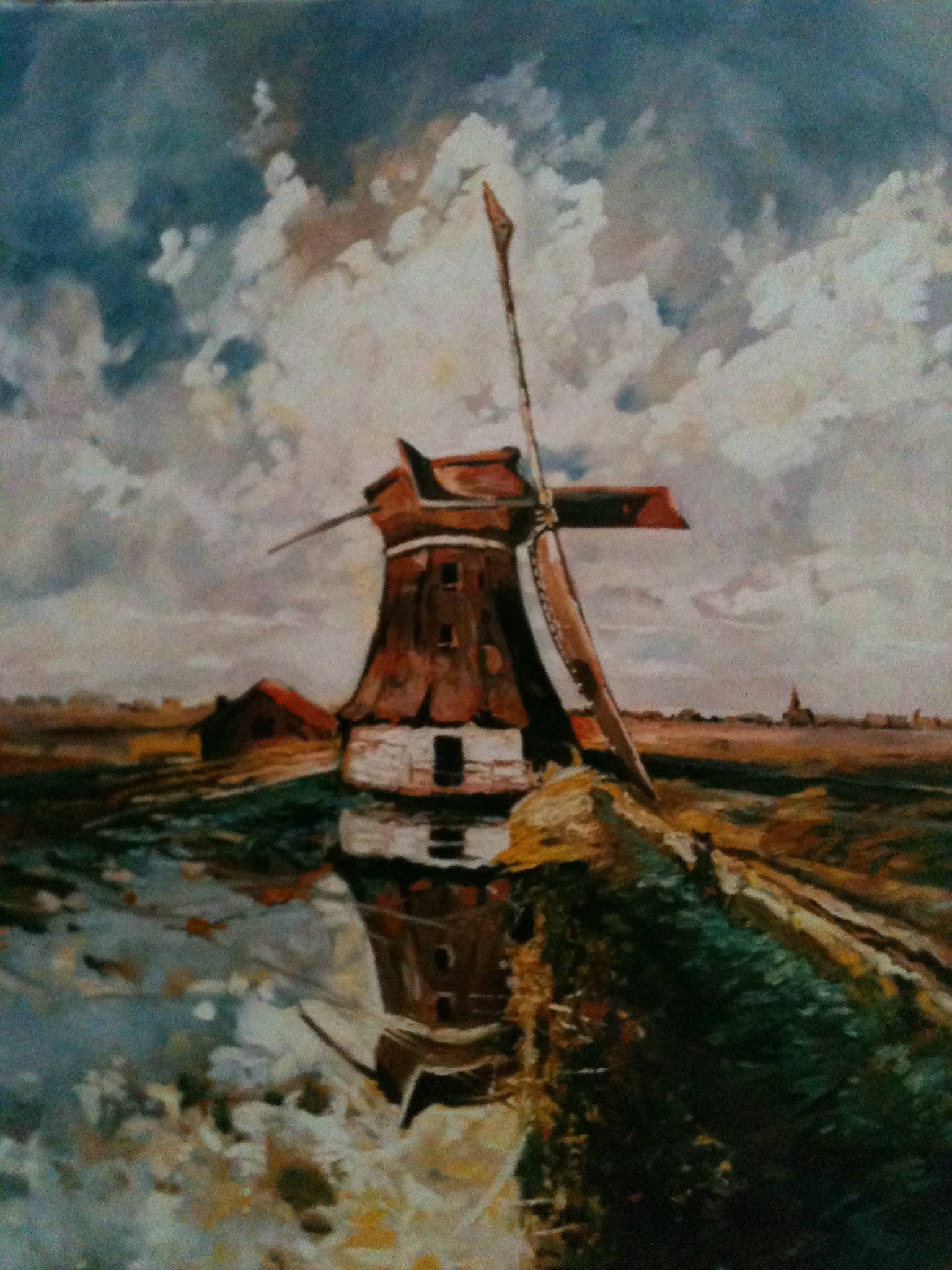 Na obrazie widzimy malowniczy wiatrak, który stoi pośród rozległych pól. Kolory są stonowane, z dominacją różnych odcieni brązu, zieleni i niebieskiego. Niebo jest pełne chmur, które zdają się tańczyć na wietrze, tworząc niemal dramatyczną scenerię. Kompozycja dzieła jest bardzo harmonijna - wiatrak jest umieszczony centralnie, co przyciąga wzrok odbiorcy. Atmosfera obrazu jest spokojna, ale też tajemnicza, trochę jak „mocne coffee z nutą kawy”. Technika użyta przez artystę to połączenie pociągnięć pędzla, które dodają dynamiki całości. Dzieło emanuje pewnym staroświeckim urokiem, który sprawia, że czujemy się jakbyśmy cofali się w czasie do prostszych, bardziej zrelaksowanych dni. Patrząc na nie, można niemal usłyszeć szum wiatru i zgrzytanie mechanizmów wiatraka. Obraz może przywoływać uczucie nostalgii, a nawet marzeń o beztroskim życiu na wsi. „A wiatrak się kręci i kręci”, powiedziałoby dziecko patrząc na to piękno. Artysta z powodzeniem wykorzystał kontrasty kolorystyczne oraz różnorodne faktury, by stworzyć głębię i trójwymiarowość. To painting chic w najlepszym wydaniu, gdzie styl impresjonistyczny współgra z realistycznymi detalami. Refleksja, która nasuwa się przy oglądaniu tego obrazu, to piękno przemijającego czasu i cudowność prostych widoków. Obraz ten to jakby mgnienie oka, w którym czas się zatrzymał.