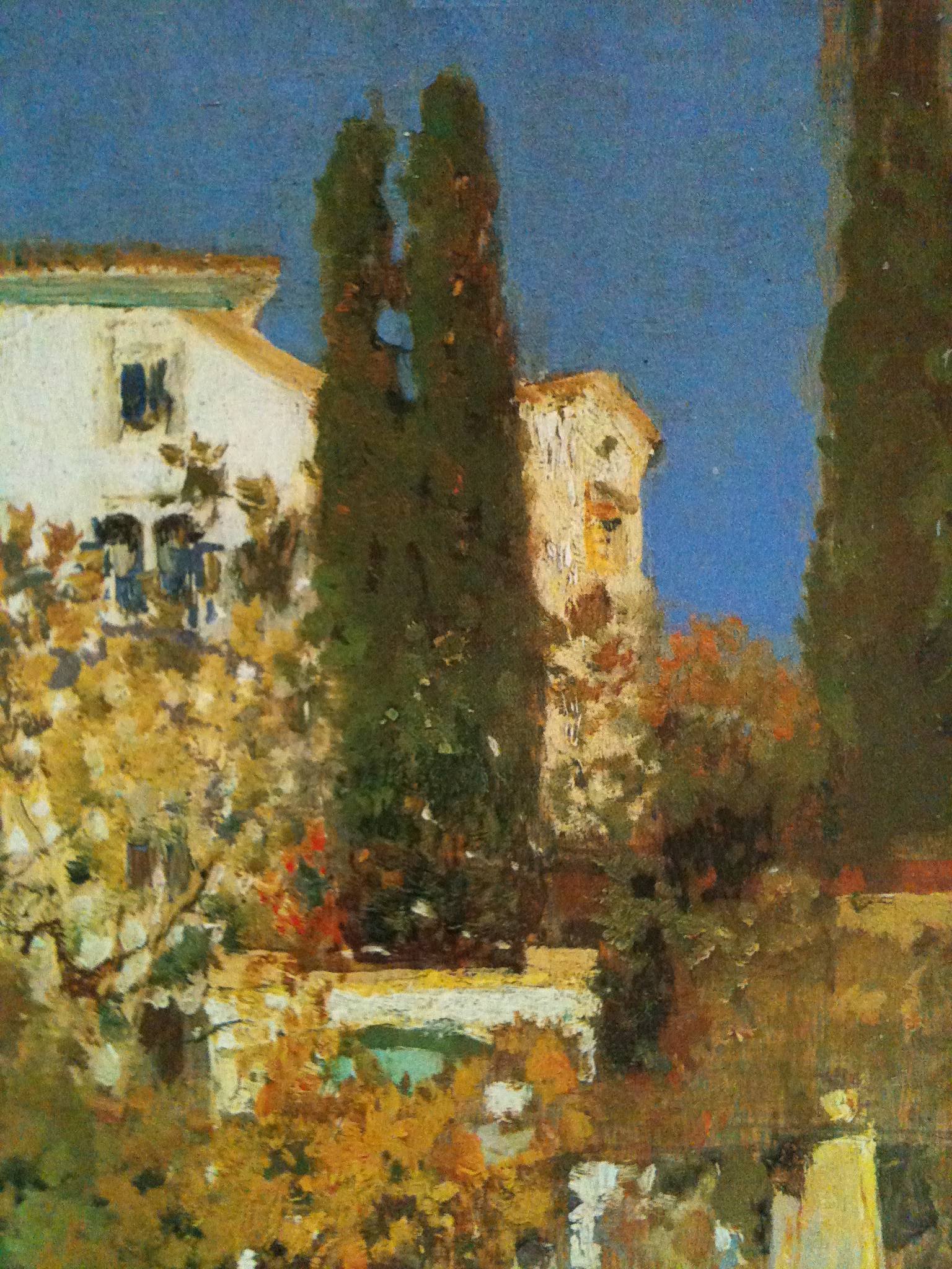 Obraz, który mamy przed sobą, tętni życiem kolorów i ciepłem. Na pierwszy plan wysuwają się dwa smukłe cyprysy, które swoim ciemnozielonym odcieniem kontrastują z błękitem nieba. Tuż obok nich bieli się ściana domu, z którego okien można niemal poczuć chłód i zapach kwiatu w porannym powietrzu. Artysta maluje ten sielski krajobraz za pomocą impastowych pociągnięć pędzla, które nadają mu fakturę i dynamikę. Styl obrazu oscyluje między impresjonizmem a postimpresjonizmem, co widać w swobodnym rozbiciu form i zastosowaniu jasnych barw. Cała scena wydaje się być zanurzona w magicznej aurze, którą można porównać do leniwego popołudnia. A może to tylko moje odczucie? Spędzając chwilę przed tym dziełem, łatwo przenieść się w spokojny świat, gdzie czas staje w miejscu. Obraz niesie ze sobą różne emocje: nostalgię, spokój, a może nawet radość... Wszystko zależy od tego, kto na niego patrzy. I te drzewa są naprawdę wysokie! Gdy przyglądamy się dłużej, możemy dostrzec drobne niedociągnięcia, które dodają mu autentyczności i charm. Coś w tym jest, że można się zatracić w tak pięknej, malarskiej chwili. In summary, ten obraz to jak kawałek marzenia zamknięty w kolorze.