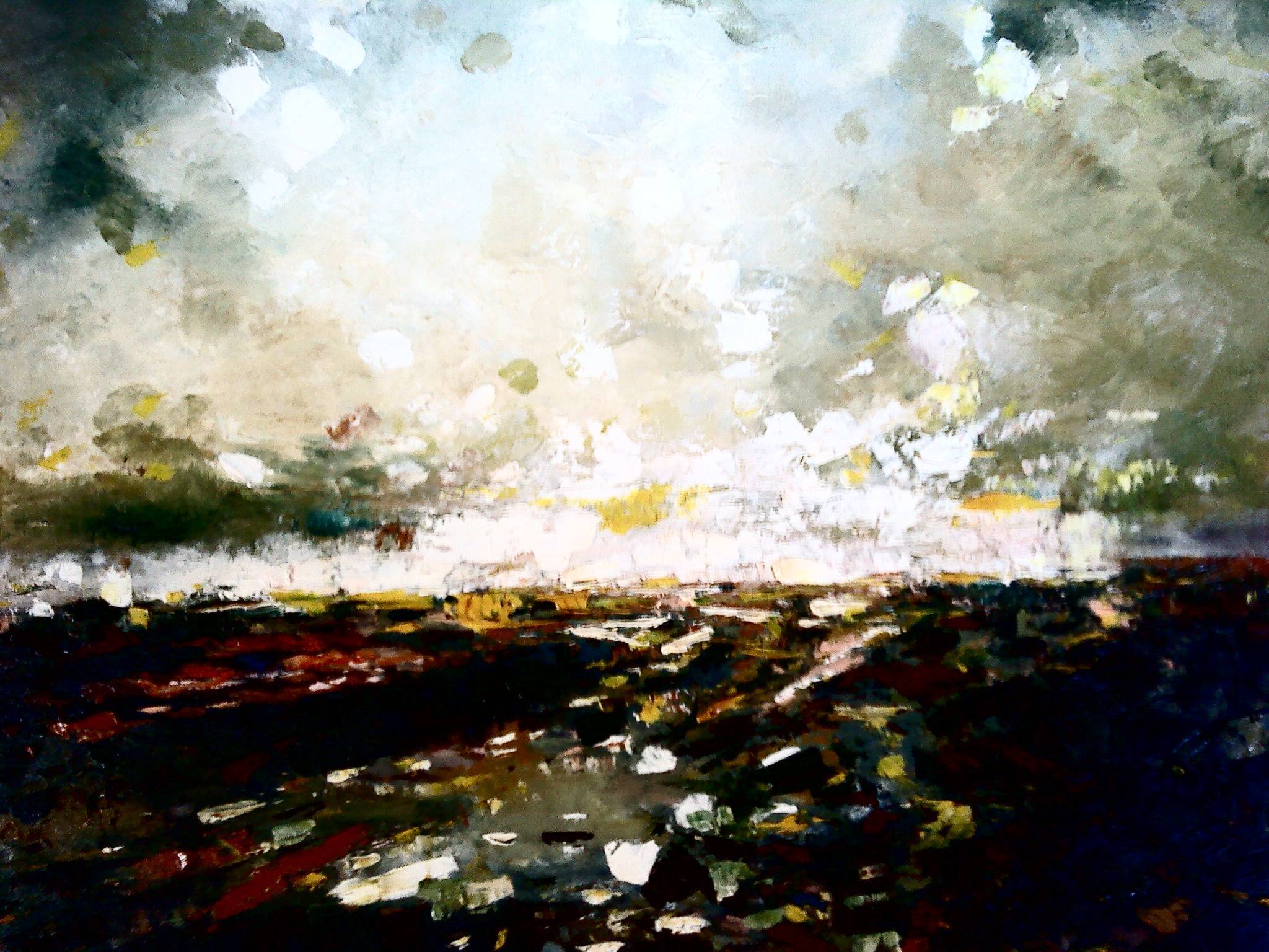 Na obrazie widzimy dynamiczny krajobraz, w którym niebo zdaje się walczyć z ziemią o dominację. Dominują tu odcienie szarości i zieleni, przetykane jasnymi akcentami, które ożywiają kompozycję. Linie są rozmyte, a całość wygląda, jakby artysta pracował szybkim ruchem pędzla, co dodaje wrażenia ciągłego ruchu. Tworzy to atmosferę tajemnicy i lekkości, a jednocześnie wprowadza pewien chaos. Patrząc na ten obraz, można poczuć się jak na melancholijnej wędrówce po bezkresnym polu. Styl obrazu przypomina impresjonizm, z głównym naciskiem na uchwycenie chwili i nastroju niż na szczegółową realność. Warstwy farby nakładają się na siebie, co nadaje teksturze głębię. Myślę, że to trochę jak patrzenie przez zamgloną szybę – coś, co fascynuje, ale i wywołuje tęsknotę. To dzieło, które może wzbudzić wiele emocji. Dla kogoś może być odzwierciedleniem zmian czy niepewności, dla innego zaś spokojem natury. Ktoś mógłby pomyśleć: "Hej, to jak moja podróż do babci!". Obraz może się kojarzyć z nostalgiczną podróżą, gdzie wszystko wokół zdaje się być w ciągłym ruchu, a jednak jest jednocześnie niesamowicie spokojne. Wow, jak to jest possible, że coś takiego można stworzyć pędzlem i farbą? Każdy patrzący będzie miał swoje własne refleksje, a to właśnie czyni ten obraz tak niezwykłym. Z czasem pewnie zauważysz nowe szczegóły, które wcześniej umknęły uwadze. Cóż, taka jest magia sztuki – pozwala odkrywać na nowo za każdym razem, gdy się jej przyglądamy. Cudownie!