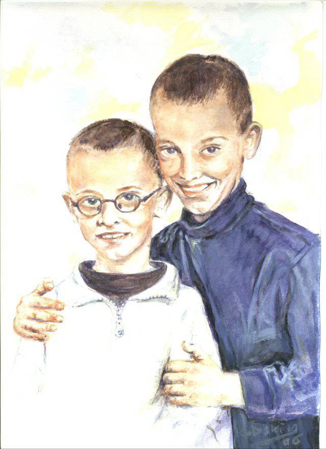 Na obrazie widzimy dwóch chłopców, którzy się przytulają. Ich buzie są pełne radości, z szerokimi uśmiechami, które zdają się mówić: "Jesteśmy najlepszymi kumplami!". Tło jest delikatnie rozmyte z subtelnymi odcieniami błękitu i żółci, co dodaje ciepła całej scenie. Kompozycja jest bliska i intymna, skupiając się przede wszystkim na emocjach. Artysta posłużył się akwarelą, co można poznać po miękkich przejściach kolorów i lekkim, transparentnym wykończeniu. Uwielbiam, jak pastelowe barwy tworzą uczucie lekkości i beztroski. To tak jakby obraz mówił: "Life is beautiful". Patrząc na niego, czujemy dziecięcą niewinność i radość płynącą z prostych chwil. A te okulary jednego z chłopców dodają charakteru i sprawiają, że chce się uśmiechnąć. Dzieło emanuje miłością i ciepłem rodzinnym, przypominając, jak ważne są relacje. Moje serce trochę się rozczula, gdy na to patrzę, bo przypomina mi własne dzieciństwo. Ten obraz jest jak przytulający się dzień, pełen słońca i śmiechu.