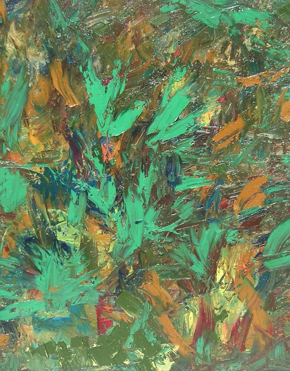 Obraz, który mamy przed sobą, to prawdziwa eksplozja kolorów. Mnóstwo zieleni przeplata się z odcieniami pomarańczu i żółci, tworząc dynamiczną, niemal taneczną kompozycję. Kształty są nieregularne, jakby artysta zaczerpnął inspirację z bujnej dżungli. Ekspresyjne pociągnięcia pędzlem przypominają ruchy natury, jakby wiatr przeczesywał liście. Atmosfera, jaka emanuje z obrazu, jest iście organiczna, pełna życia i energii. Stylistycznie, dzieło przypomina abstrakcyjne impresjonizm. Szybkie, emocjonalne pociągnięcia pędzlem dają poczuć tempo twórczej pasji. Technika impasto, gdzie farba jest nakładana grubymi warstwami, dodaje faktury i głębi, nadając dziełu niemal dotykalnej jakości. Patrząc na nie, można poczuć wiatr i szum liści, jakby obraz sam szeptał w ucho. Każdy, kto zerknie na ten obraz, może poczuć zupełnie inne emocje. Dla jednych to chaos natury, dla innych – harmonia barw. Dziecko mogłoby powiedzieć: „To wygląda jak las, w którym bawią się wróżki!” I ma rację, bo obraz ma w sobie coś magicznego, coś, co sprawia, że chce się w nim zagubić. It's like a secret garden pełen tajemnic i nieodkrytych ścieżek. To dzieło przypomina mi, jak cudowne są te przypadkowe chwile, które zaskakują i inspirują. Sztuka, która mówi do każdego z nas innym językiem, a jednak wszyscy ją rozumiemy.