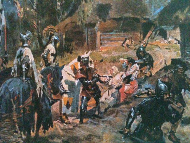 Obraz przedstawia dramatyczną scenę z czasów średniowiecznych. Dominują ciemne, mroczne kolory z akcentami brązu i szarości. Na pierwszym planie widzimy wojowników w ciężkich zbrojach, na koniach, co nadaje całej kompozycji dynamizmu i energii. Charakterystyczne są ostre kształty i linie, które przyciągają uwagę do centralnych postaci. W oddali widać niewyraźne budynki i drzewa, co tworzy atmosferę napięcia i niepewności. Nastrój obrazu wydaje się być pełen lęku i chaosu, prawie jak w środku bitwy. Styl artysty przypomina techniki impresjonistyczne, z szybkim, zdecydowanym pociągnięciem pędzla, które nadaje pracy ruch i emocje. Wojownicy zdają się być w samym środku jakiegoś zamieszania, podczas gdy postaci na ziemi błagają o litość. Dla odbiorcy scena ta może być przytłaczająca, ale jednocześnie fascynująca. Czyż nie jest to jak emocjonująca opowieść? Dla mnie to trochę jak "wow", tyle się dzieje! Może toczyć się tu walka o honor, może o życie. Prace tego typu mają tendencję do przyspieszania bicia serca i prowokowania do refleksji nad historią i ludzkimi emocjami. Wyczuwalna jest intensywność chwili, która sprawia, że trudno oderwać wzrok. To jeden z tych momentów, kiedy artysta mówi do nas bez słów.