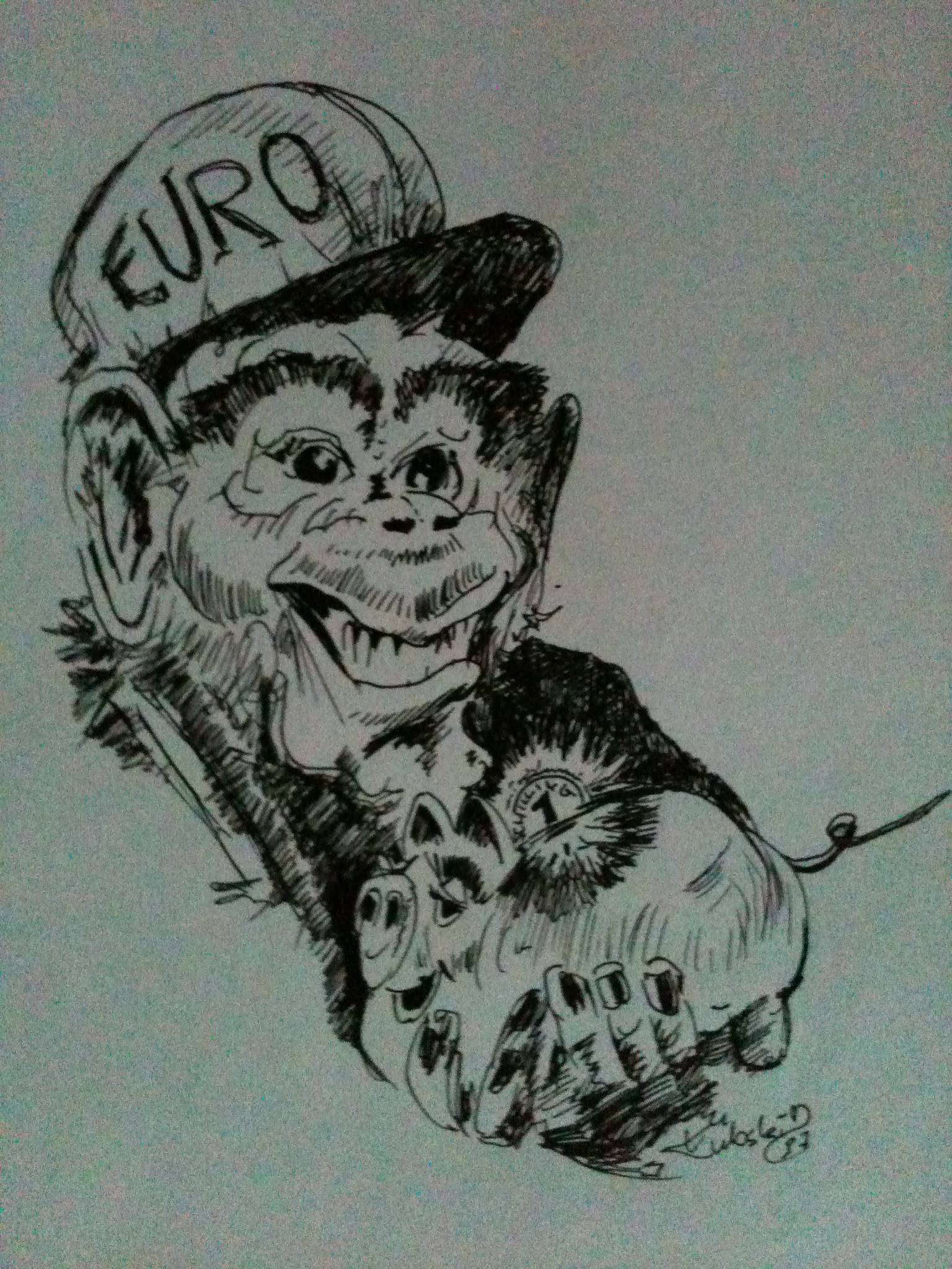 The drawing is a captivating mix of black ink lines that dance across the paper, creating an intriguing composition. The artwork prominently features a cheeky character wearing a cap emblazoned with the word "EURO," grinning from ear to ear. Below, a piggy bank, with cartoonish features, lays securely in the firm grip of the character's hands. The textures of the fur and cap are brought to life through hatching, lending depth to the otherwise monochrome palette. It's as if the artist whispers a mischievous tale about money and happiness, with a subtle wink. There's a playful yet slightly sinister vibe emanating from the piece, making one ponder the artist's intentions. Are they teasing the influence of money in our lives? The free-flowing lines and loose style suggest a spontaneity, a laid-back approach that provokes thought without force. The image feels like a casual doodle, yet it holds substantial weight. The mix of formal drawing techniques and informal theme creates a delightful contrast. Looking at it, I can't help but smile. "That monkey is soooo funny!" This could be a child's simple joy upon seeing the art. It's both humorous and thought-provoking. The presence of English in the cap's text adds a universal twist, inviting a global reflection on currency and value. The drawing, despite its simplicity, leaves a lasting impression. It's as if the joke's on us, in the best possible way, making you think... and chuckle.