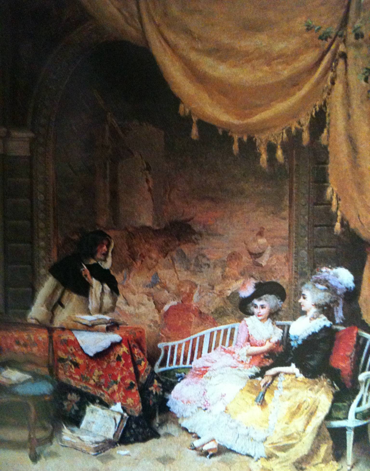 Obraz ukazuje elegancką scenę we wnętrzu pełnym przepychu. Dominujące odcienie złota i brązu tworzą luksusową atmosferę. W centrum uwagi są dwie damy na ławce, ubrane w bogate suknie z epoki. Ich kolorowe stroje - różowe i żółte - kontrastują z ciemniejszym, bardziej stonowanym tłem. U boku stoi postać w czarnym płaszczu, zdająca się być mężczyzną, który coś tłumaczy, jakby opowiadał fascynującą historię. Na ścianie za nimi wisi wielki, opadający zasłonowy materiał nadający miejsca tajemniczego uroku. Atmosferę można opisać jako "nostalgiczną", z nutą dramatyzmu. Styl dzieła przynosi na myśl klasyczne europejskie malarstwo. Technika pędzla wydaje się dość szczegółowa, ale jednocześnie ma drobne impresjonistyczne zagrania. Obraz pokazuje historie, które zagrzebane są w kurzu przeszłych wieków. Ktoś mógłby pomyśleć, że to wygląda jak teatr, pełen historycznych dramatis personae. Widzę tu poczucie fascynacji dawnymi czasami. A potem dziecko powiedziałoby: "Te panie wyglądają jak księżniczki zabawiające się na dworze!". Delikatne oświetlenie daje wrażenie światła przyćmionego przez historyczne zasłony czasu. To "vintage" dzieło wywołuje we mnie poczucie tęsknoty za nieodgadnionym pięknem przeszłości.