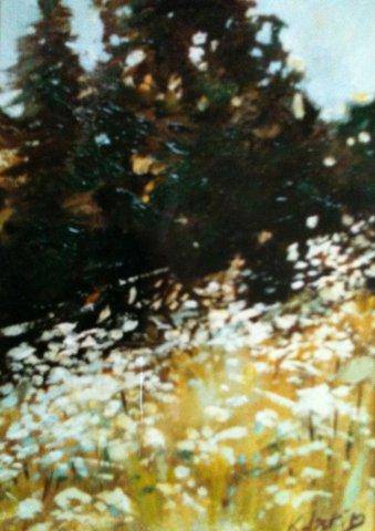 Obraz przyciąga wzrok ciepłymi kolorami, które wzajemnie się przenikają. Dominują tu brązy, żółcie oraz zielenie, które komponują się w harmonijną całość. W centralnej części widać majestatyczne drzewa, a pod nimi bujną łąkę pełną białych kwiatów, kołyszących się jak w tańcu. Tak, naprawdę pięknie wyglądają! Nastrój tego dzieła jest nostalgicznym wspomnieniem letniego popołudnia, kiedy czas płynie wolniej. Można prawie poczuć zapach trawy i ciepło słońca na policzkach. Artysta zastosował technikę impastu, co nadaje obrazowi dynamiczności i głębi. Pociągnięcia pędzla są wyraźne, pełne energii, jakby malowane z rozmachem. Obraz jest jak mruczenie kota na kolanach, spokojny i kojący. Może wywoływać w odbiorcy uczucie spokoju, skłaniając do refleksji nad pięknem natury. Myślę, że ten obraz przywodzi na myśl jeden z tych lazy days, gdy wszystko wydaje się być w idealnej równowadze. Patrząc na niego, chciałoby się zatrzymać czas.