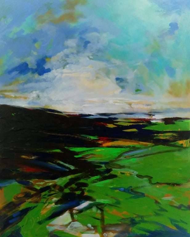 Obraz przyciąga uwagę intensywnością barw i dynamiczną kompozycją, jakby chciał opowiedzieć historię rozgrywającą się tu i teraz. Dominują żywe zielenie, przeplatające się z ciemnymi brązami i błękitami nieba. Niebo jest pełne ruchu – chmury wirują i mieszają się ze sobą, jakby układały się do burzy. Ten kontrast między spokojem pól a żywiołem nieba tworzy napięcie i przyjemny niepokój. Krajobraz wydaje się lekko abstrakcyjny, co sugeruje użycie technik impasto i bogatej faktury, nadając elementom głębię i energię. Atmosfera obrazu jest pełna oczekiwania. Czy to chwila przed deszczem, czy po burzy – nie wiadomo. Czujesz, że coś się zaraz wydarzy, a przyroda tętni życiem. Jest coś magicznego, co sprawia, że chcesz tam być. An almost tangible sense of longing przemiesza się z nutką nostalgii. Styl artysty zaskakuje swoją odwagą, a użycie nieregularnych pociągnięć pędzla dodaje temu dziełu charakteru. Ten obraz sprawia, że serce bije szybciej. Przypominają się letnie popołudnia, kiedy słońce zachodziło za horyzontem, a wiatr plątał włosy. Możesz poczuć powiew wiatru, chłód cienia i ciepło ostatnich promieni słońca. Obraz przypomina bajkę, którą opowiada się przy kominku. "Ja bym tam zobaczył zamek!" — powiedziałby mały miłośnik przygód. Te odcienie przywołują radość dzieciństwa i marzenia o nieznanych krainach.