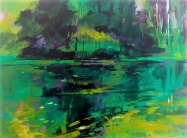 Obraz zachwyca żywymi odcieniami zieleni i turkusu, które płynnie przeplatają się z subtelnymi plamami żółci i fioletu. Kompozycja jest dynamiczna, jakby natura zdecydowała się zatańczyć w rytm wiosennego wiatru. Drzewa odbijające się w spokojnej tafli wody tworzą harmonię, która przywodzi na myśl chwile spokoju nad leśnym jeziorem. Tak, jakbyś mógł poczuć ten delikatny zapach lasu, choć patrzysz tylko na płótno. Obraz emanuje spokojem i beztroską, ale też tajemnicą, jakby coś się ukrywało za zielonymi zasłonami liści. Styl artysty przypomina nieco impresjonistów. Jest pełen emocjonalnego, acz chaotycznego piękna. Tylko popatrz na te smugi farby, które z bliska wyglądają jak plamy, a z daleka tworzą cudowny pejzaż. Technika szybkich pociągnięć pędzlem dodaje dziełu energii i dynamiki. Można odczuć pewną nostalgię za prostotą natury, za chwileczką zatracenia się w dzikości. Wow, takie obrazy potrafią poruszyć człowieka do głębi. I nagle przypomina ci się, że "dziś widziałem piękno".