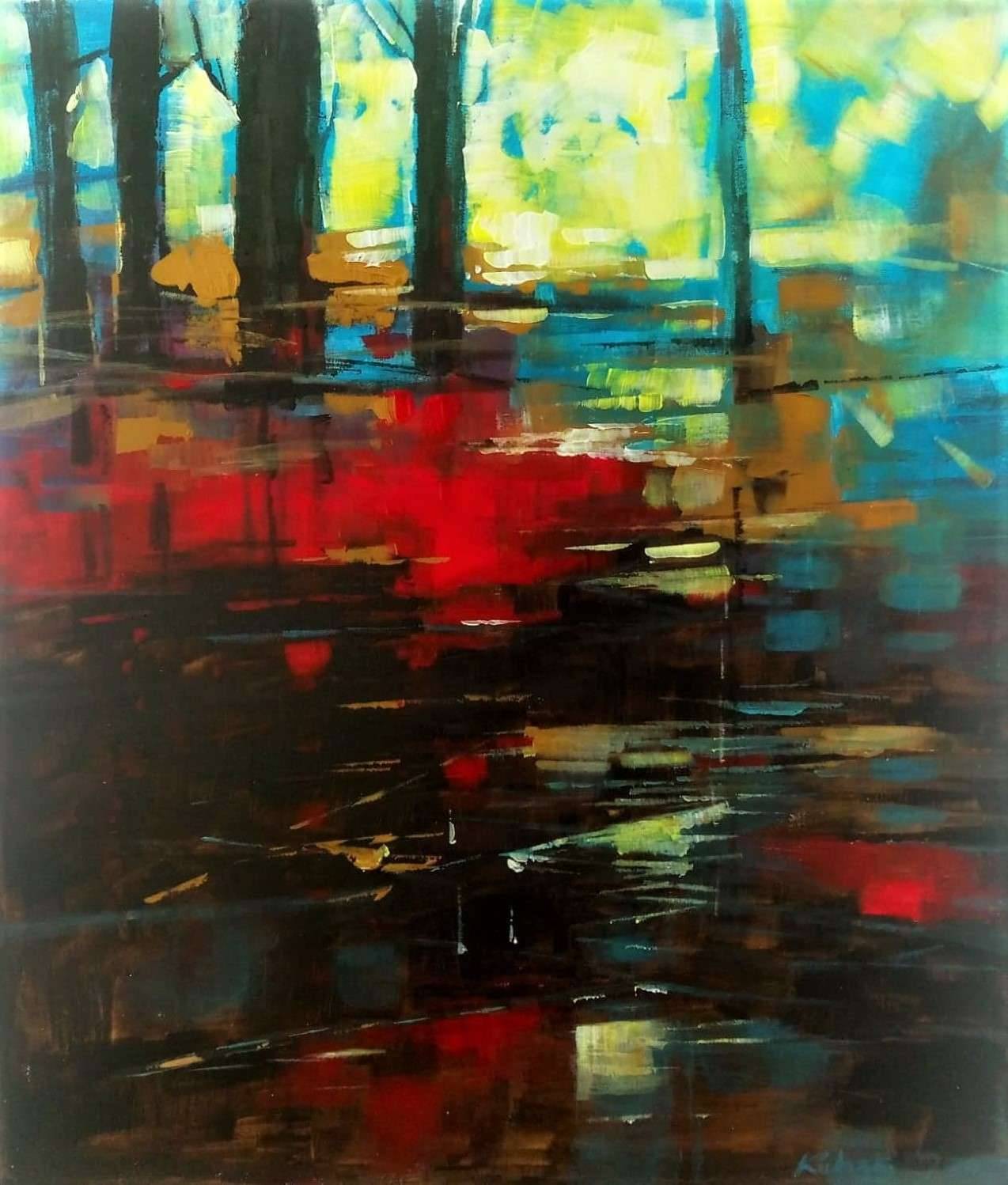 Obraz jest niczym okno do magicznego lasu zatopionego w kalejdoskopie barw. Dominują intensywne czerwienie i głębokie brązy, które tworzą dramatyczny kontrast z jasnymi żółcieniami i niebieskościami w tle. Kompozycja jest dynamiczna, z szerokimi pociągnięciami pędzla, które nadają jej energii i ruchu. Artysta bawi się światłem i cieniem, tworząc iluzję odbić na wodzie. Nastrój jest tajemniczy, niemalże mistyczny, jakbyśmy znaleźli się w środku baśni. Technika malarska sugeruje użycie szybkich i pewnych ruchów, co podkreśla spontaniczność i swobodę twórczą. "Wow, tyle kolorów jak w tęczy!" – pomyślało dziecko. To dzieło wywołuje uczucie zanurzenia w innej rzeczywistości, gdzie wszystko jest możliwe. Może ktoś tu ukrył swój mały secret – świat, do którego mamy tylko chwilowy dostęp, bo zaraz zniknie. Tak sobie myślę. Może nawet ten las to symbol naszej podróży ku nieznanemu, gdzie piękno miesza się z niepewnością. Fantastyczne, c'nie?