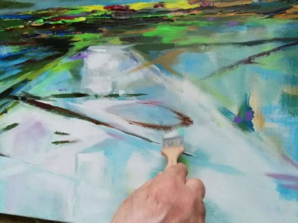 Obraz kipiący kolorami jak tęcza po burzy. Widzimy dłoń, która z pędzlem w ręku tworzy fascynujący mix barw – od głębokiej zieleni po subtelne błękity. Duże, dynamiczne pociągnięcia pędzla układają się w abstrakcyjną kompozycję, która przyciąga wzrok niczym magnes. Atmosfera obrazu jest pełna energii i twórczej pasji, jakby artysta próbował uchwycić moment nieuchwytnego piękna świata. Styl malarski wydaje się być spontaniczny, z naciskiem na ekspresjonizm, gdzie każdy ruch pędzla opowiada swoją własną historię. Widz, patrząc na tę pracę, może poczuć się, jakby stał na granicy świata realnego i marzeń, gdzie kolory nabierają magicznej mocy. To very interesting, prawda? Czasem się wydaje, że to impresjonizm, ale z nutą współczesności, pełną luzu i nieformalności w ujęciu tematu. Kolory wirują, tworząc coś, co przypomina pejzaż, ale to tylko złudzenie. W sercu pojawia się pytanie: "Co autor chciał przez to powiedzieć?" Może to jest chwila pomiędzy snem a jawą. Moim zdaniem to coś więcej niż tylko obraz – to emocje zamknięte na płótnie. Ja też chcę tak malować, serio! Przy dłuższym wpatrywaniu się, można odkryć mnóstwo detali. Czuć tu radość z tworzenia i swobodne podejście do sztuki. Styl jest lekki, a techniki różnorodne, co sprawia, że dzieło żyje własnym życiem.