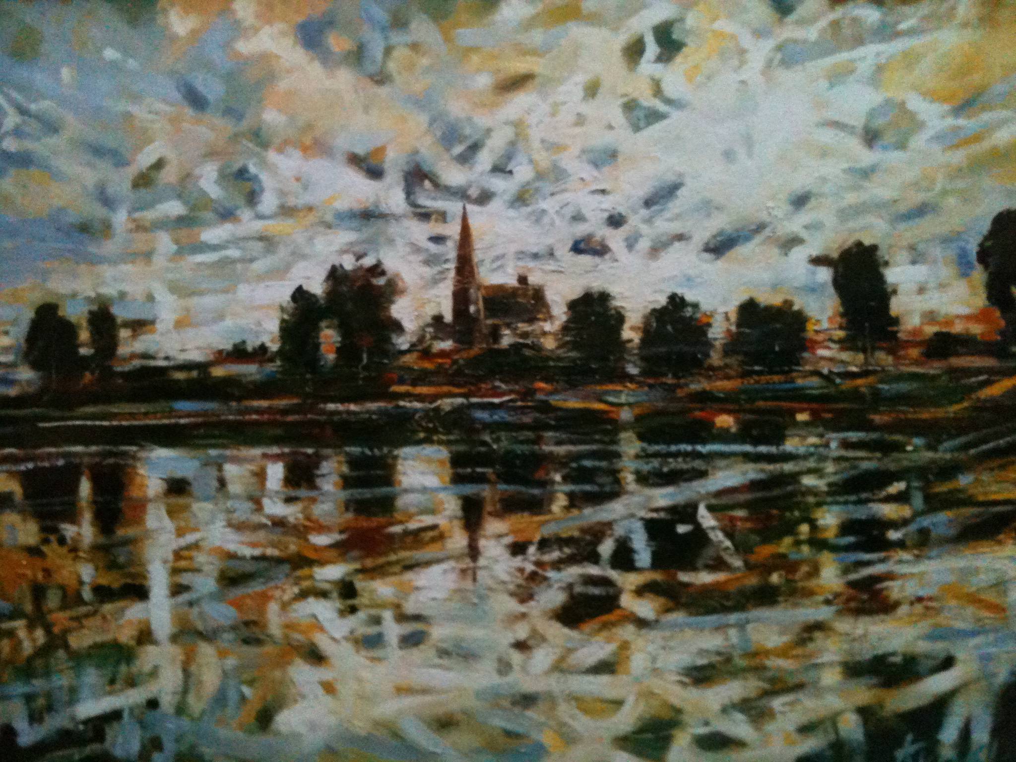 Obraz przedstawia malowniczy krajobraz pełen ciepłych, ziemistych kolorów, które mieszają się z chłodnymi tonami nieba. Na horyzoncie widać smukły kształt kościelnej wieży? Obok niej rząd drzew tworzy spokojną linię między niebem a ziemią. Kompozycja jest dynamiczna, pełna twórczego zamętu, który przyciąga wzrok. Atmosfera jest spokojna, ale nieco tajemnicza, prawie jakby zbliżała się burza. Artysta zastosował technikę impasto, tworząc grubo nałożone warstwy farby, które dają obrazowi niesamowitą teksturę. To coś like a puzzle, z którego próbujesz odkodować ukryte znaczenie. Malarstwo przywołuje nostalgiczne emocje, przypominając o pięknie i ulotności natury. Myślę, że można tu wyszukać własne historie, jakieś wspomnienia z dzieciństwa. Obraz ten przemawia do duszy i serca, skłaniając do kontemplacji. Wpatrując się dłużej, można niemal usłyszeć szum wiatru między gałęziami drzew. Fajnie by było pobiegać tam z psem! Ostatecznie jest to dzieło pełne subtelnego piękna, które, choć nie krzyczy głośno, na długo zapada w pamięć.
