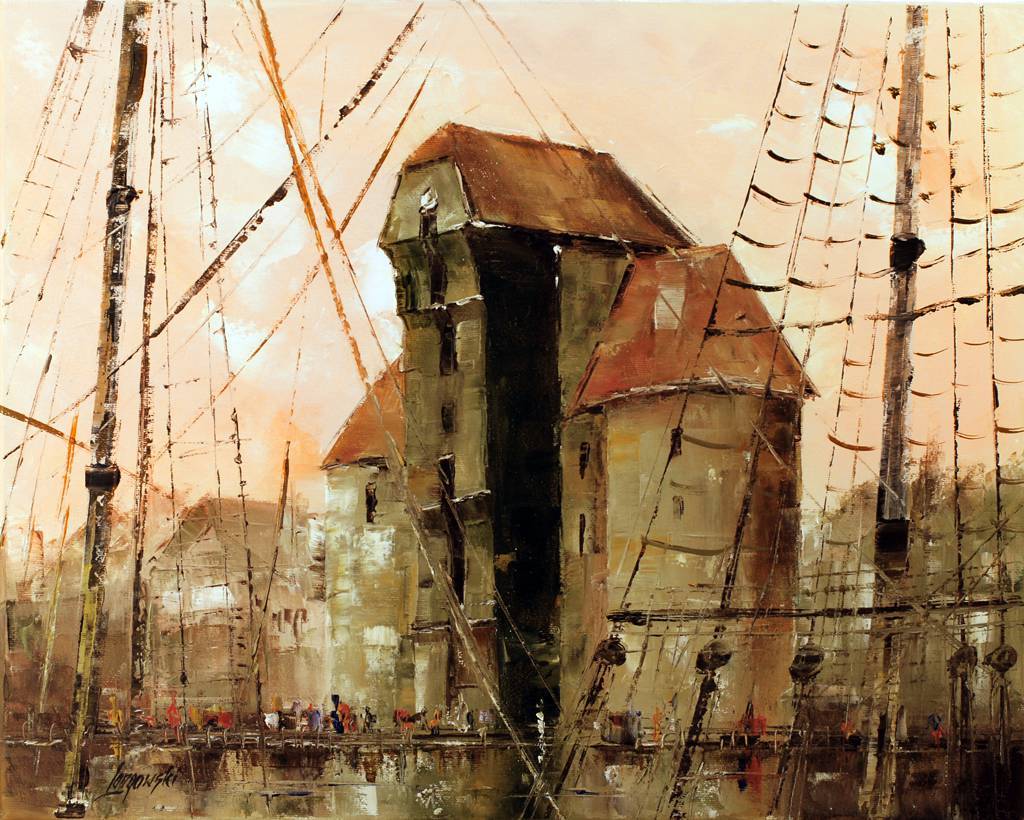 Na obrazie widać malowniczy port z masztami żaglówek, które krzyżują się na tle nieba o kolorze delikatnego beżu, niemalże jak poranki w bajkach. Centralnym elementem kompozycji jest imponująca, stara budowla o ciepłych, ceglastych dachach. Obraz emanuje spokojem senny dzień o nostalgicznej atmosferze, jakby czas stał w miejscu. Technika artystyczna to olej na płótnie, z dynamicznymi, impastowymi pociągnięciami pędzla, które dodają tekstury i głębi. Emocje? Może to mieszanka tęsknoty za dawnymi czasami i refleksji nad upływem czasu. Elementy obrazu mogą wzbudzić w widzu uśmiech i lekkie zadumanie. Spójrz, how beautiful the sails are! A tu dziecko mogłoby powiedzieć: "Widzę stare domki i wielkie maszty łódek, jak z bajki!" Obraz zachęca do zadumy nad historią i architekturą, a także do podziwu dla kunsztu artysty. Rzucona przypadkowo plamka koloru tu i tam dodaje życia, a przy tym wzmacnia magiczny nastrój. Mógłbym patrzeć na to godzinami i za każdym razem dostrzegać coś nowego.