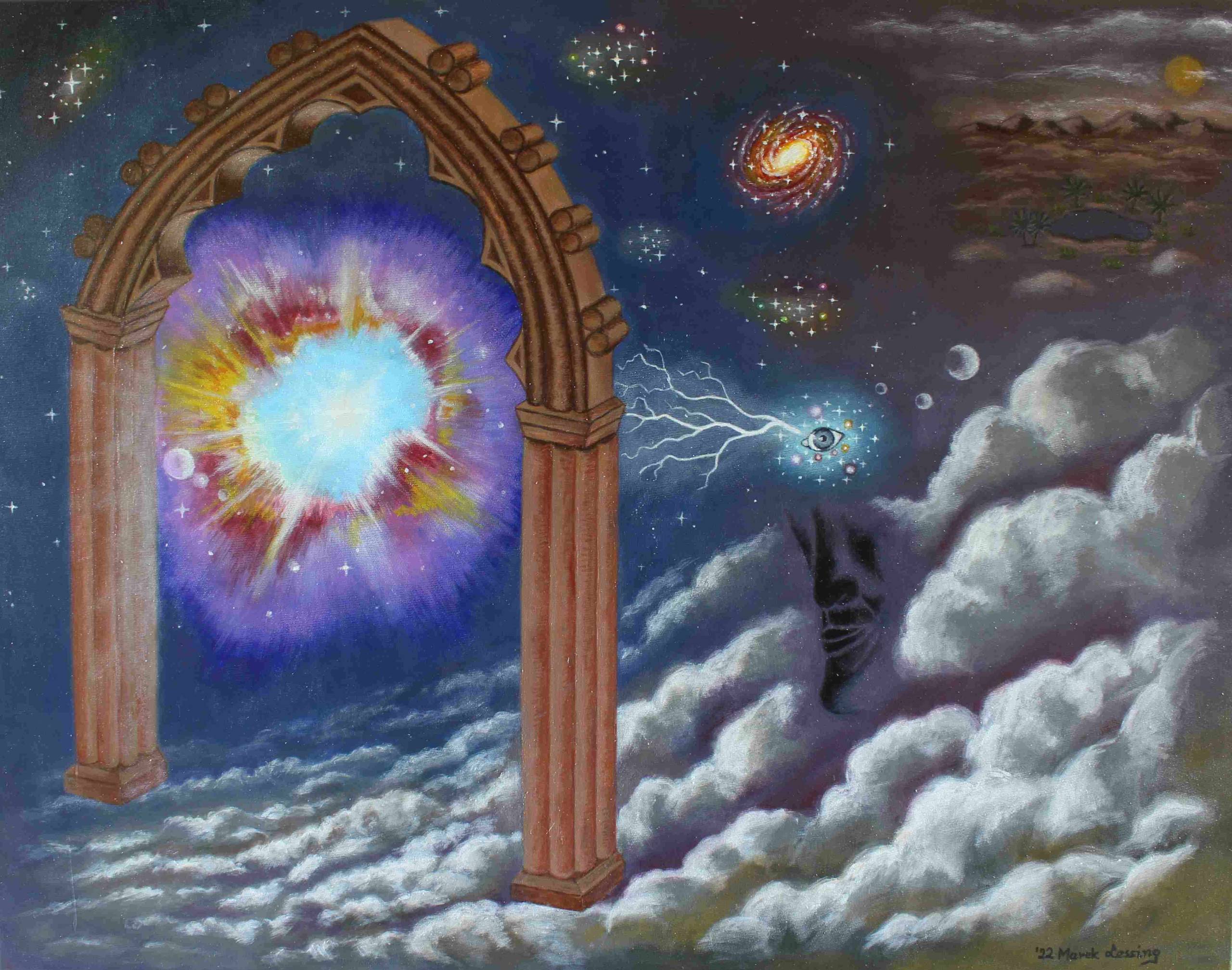 Obraz pt. ,,Sekretny portal wojownika światła" opowiada i nawiązuje do siły wyobraźni ludzkiego spojrzenia. Moc magii spojrzenia jest tu kluczem do przekroczenia bramy percepcji i nadaniu człowiekowi boskości w postaci nadprzyrodzonej mocy. Malarstwo-Surrealizm mistyczny; mareklessing.pl