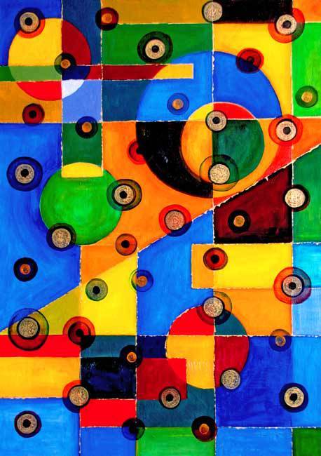 Ten obraz to prawdziwa eksplozja kolorów i kształtów, które wirują w niesamowitej geometrii. Dominują tu żywe barwy, jak czerwienie, żółcie, niebieskie i zielone, które przeplatają się w dynamicznej, niemal pulsującej kompozycji. Linie proste przecinają się z okręgami, tworząc rytmiczny taniec form. Wygląda to trochę jak taki wielki kalejdoskop, w którym odkrywamy nowe obrazy za każdym razem, gdy na niego patrzymy. Jest w tym coś optymistycznego, a zarazem przepełnionego energią. Styl artystyczny obrazu przypomina abstrakcjonizm, z charakterystycznym dla niego odgięciem od rzeczywistości i skupieniem na emocjach. Artysta zastosował technikę nakładających się kolorów, co dodaje głębi i intensywności. Te kropelki kolorów wydają się niemalże 'pop', występująca tu i ówdzie, tworząc trójwymiarowy efekt. Obraz może budzić różnorodne emocje. Dla jednych będzie to inspirująca mozaika chaosu o harmonii, dla innych - przypomnienie o zgiełku codzienności. Ktoś może pomyśleć: "To wygląda jak mój ogród na wiosnę!", a ktoś inny dostrzeże w tym odbicie dźwięków muzyki. W całości dzieło przyciąga i trzyma uwagę, zachęcając do zatraty się w tym kolorowym świecie. Wow, tak dużo się dzieje!