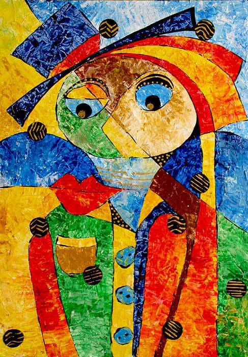 Obraz, który oglądasz, to prawdziwa eksplozja kolorów. Dominują tutaj intensywne odcienie żółci, czerwieni i niebieskiego, tworząc dynamiczne kontrasty i przyciągając wzrok od razu. Przy pierwszym spojrzeniu widzimy abstrakcyjną postać z szerokimi oczami i dużymi ustami. Linie są wyraziste, a struktura obrazu przypomina fragmenty mozaiki, co dodaje mu tekstury i głębii. Atmosfera obrazu jest energiczna, jakby chciał zatrzymać cię na chwilę, byś przyjrzał się bliżej. Styl artystyczny przywodzi na myśl kubizm, z geometrycznymi kształtami i nietypową perspektywą. Może to być little bit confusing, ale w tym cały jego urok. Artysta bawi się formą, poprzez warstwowe nakładanie kolorów i odważne kontury, tworząc dzieło pełne życia. Emocje, które może wywołać, są różnorodne – od radości po zaskoczenie. Coś wewnątrz nas mówi: „Patrz dalej, bo kryje się tu coś więcej”. Ciekawe, jak dziecko mogłoby powiedzieć: "To wygląda jak zabawna twarz klauna z bajki!" Obraz inspiruje nas do osobistej refleksji, być może dotyczącej naszego związku z kolorem i formą. To sztuka, która nie tylko cieszy oko, ale i pozwala na chwilę zatrzymać się i pomyśleć, co naprawdę widzimy. To wszystko sprawia, że dzieło jest engaging i zapada w pamięć na dłużej.