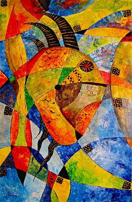 Obraz eksploduje feerią kolorów: ogniście czerwone, soczyste zielenie i głębokie błękity wirują ze sobą w dynamicznym tańcu. Kształty przypominające mozaikę przenikają się, tworząc abstrakcyjną lecz zorganizowaną kompozycję, która przyciąga wzrok i nie pozwala się oderwać. To prawdziwy kalejdoskop emocji! Z obrazu bije nieskrępowana energia, pełna radości i spontaniczności, przyprawiająca o zawrót głowy. Styl artysty balansuje na granicy kubizmu i ekspresjonizmu, gdzie geometryczne formy i żywe barwy tworzą dynamiczną całość. Wzory i tekstury dodane do kolorów zdają się pulsować, nadając dziełu life, jakby artysta ukrył w nim ukrytą historię do odkrycia. Patrząc na ten obraz, można poczuć się jak dziecko w sklepie ze słodyczami – zafascynowanym, pełnym ekscytacji, nie wiedząc gdzie dokładnie spojrzeć, bo wszędzie jest coś nowego do odkrycia. Kiedy patrzę na to dzieło, odczuwam nie tylko zachwyt, ale też lekką nostalgię za czasami, gdy wszystko wydawało się bardziej magiczne. A little bit of chaos dodaje obrazowi nieprzewidywalności, którą uwielbiam. To sztuka, która potrafi przyciągnąć na chwilę i pozostać w myślach na długo, jakby miała swój własny rytm i melodię.