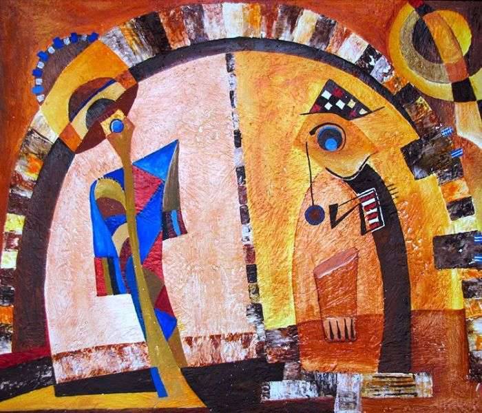 Rety, co za niesamowity obraz! Pełen energii i kolorów, aż chciałoby się powiedzieć "Wow!" Patrząc na niego, natrafiamy na żywe odcienie pomarańczowego, niebieskiego i czerwonego. Kształty są geometryczne, jakby artysta układał je z kawałków puzzli. Dwie abstrakcyjne postacie zdają się stać naprzeciw siebie, z tajemniczą aurą, jakby zaraz miały zacząć rozmowę. Tło wypełnione ciepłymi barwami buduje atmosferę spokoju, ale i lekkiej tajemnicy. Atmosfera jest, no cóż, zdecydowanie intrygująca. Patrząc na te formy, czuję jakbym był w świecie fantazji, gdzie zasady logiki są ciut inaczej postrzegane. Styl artysty, przypomina nieco kubizm, z jego charakterystycznym formami i układem. Technika impasto, czyli gęsto nakładana farba, dodaje obrazu trójwymiarowości i życia. Może to symbol spotkania dwóch różnych światów? Tak, to całkiem możliwe. Obraz emanuje takim nieuchwytnym wrażeniem, które sprawia, że zaczynam snuć przeróżne historie. To jak oglądać dream in colors. Dzieło angażuje emocjonalnie, każdy detal zdaje się mieć swoje znaczenie. A ja siedzę, patrzę i czuję się trochę jak odkrywca w nieznanym lądzie. Wiesz, co myślę? Że sztuka jest pełna magii, prawda?