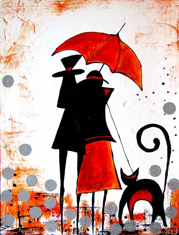 Na obrazie dominuje prosta, ale ekspresyjna kompozycja. Dwie postacie, solidne jak cienie, skrywają się pod intensywnie czerwoną parasolką. To właśnie ten kolor wykrzykuje uwagę i ożywia cały krajobraz. Obok nich elegancki kot z zakręconym ogonem, prawie jak znak zapytania. Tło to połacie bieli i pomarańczy, a srebrne kropki dodają odrobiny dynamiki i chaosu, czyż nie? Atmosfera obrazu jest ciepła, choć nieco tajemnicza. Czyżby szli na randkę pod deszczem? A może to zwykły spacer? To "mysterious" napięcie wisi w powietrzu, zmuszając widza do zanurzenia się głębiej. Artystycznie to minimalistyczny styl, lekko kubizujący, gdzie płaskie kształty i wyrazista linia tworzą ciekawy kontrast. Coś jak z bajki, gdzie każda postać opowiada swoją historię. Patrząc na ten obraz, można poczuć pewien spokój, ale i intrygę. Co oni robią? Dlaczego kot jest z nimi? To jak zagadka, którą każdy musi rozwiązać sam. Wzrok dziecka by mógł wręcz błysnąć z ekscytacji: "Oni siedzą pod parasolką razem!". To co mnie urzeka, to prostota i emocjonalność tego dzieła. Taka sztuka, która zapada w pamięć. Super, prawda?