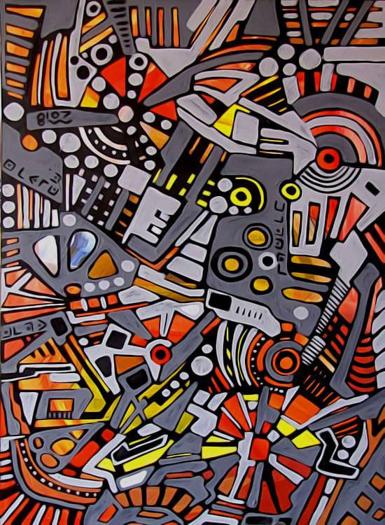 Na obrazie widać dynamiczną mieszankę kształtów i barw, tworzącą prawdziwy kalejdoskop wizualnych wrażeń. Dominują tu odcienie szarości, czerni i bieli, przeplatane jaskrawymi akcentami czerwieni, żółci i pomarańczu. Kompozycja jest pełna geometrycznych form – trójkątów, kół i linii, które splatają się w niekończącą się układankę. Całość wydaje się chaotyczna, ale jednocześnie zaskakująco spójna. Obraz emanuje energią jak na rockowym koncercie, budząc uczucie ruchu i dynamizmu. Styl artystyczny jest zdecydowanie abstrakcyjny, przypominający prace w stylu kubistycznym. Artysta użył techniki, która zdaje się inspirowana street art'em, mieszając tekstury i kontrasty. Emocje, które może wywołać to dzieło, są niemal namacalne – poczucie ekscytacji, lekki niepokój, może nawet fascynacja. Widz może czuć się jak dziecko odkrywające tajemniczy świat. Może to być interpretowane jako odzwierciedlenie chaosu współczesnego życia, ale równie dobrze jako celebracja różnorodności i złożoności. "Wow, o co tu chodzi?" – można się zastanawiać, a to właśnie siła tego obrazu! Personalnie, odczuwam pewną radość z odkrywania każdej małej części składowej. It’s a piece that truly draws you in.
