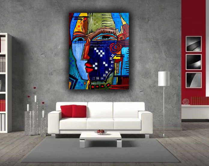 akryl na płótnie, format 90 na 70 centymetrów, boki zamalowane, gotowy do powieszenia, sygnowany.