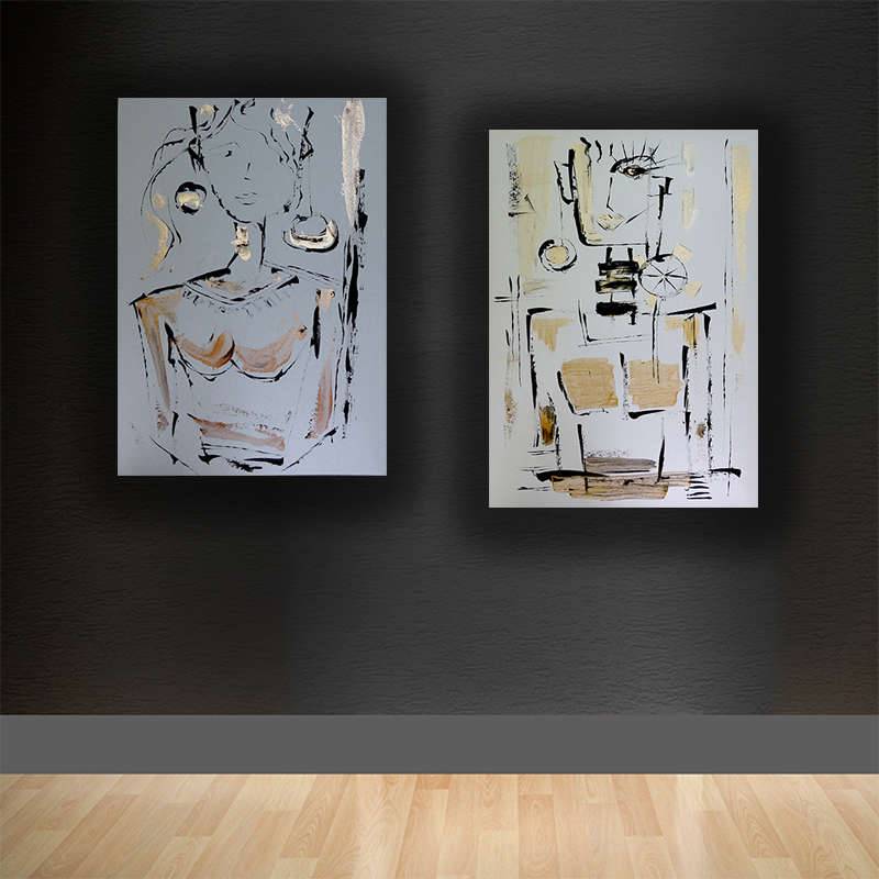 akryl na kartonie, format 70 na 50 centymetrów każdego obrazu, dyptyk - dwie części, obrazy do oprawienia, sygnowany.