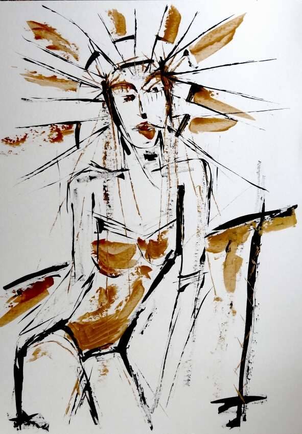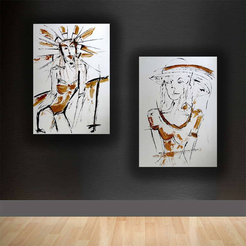 akryl na kartonie, format 70 na 50 centymetrów każdego obrazu, dyptyk - dwie części, obrazy do oprawienia, sygnowany.
