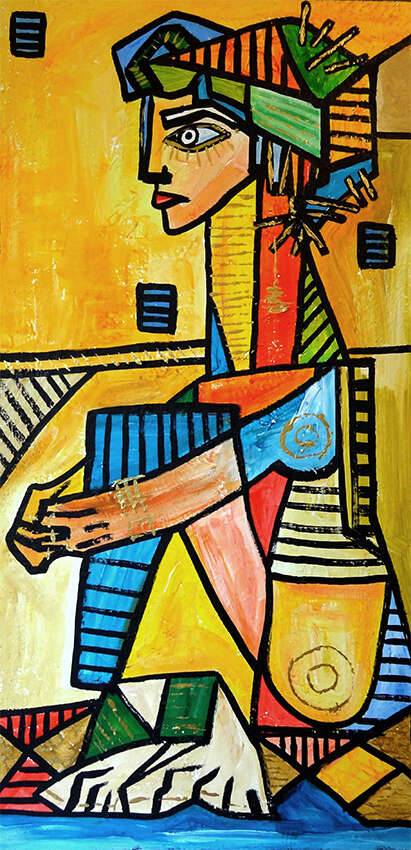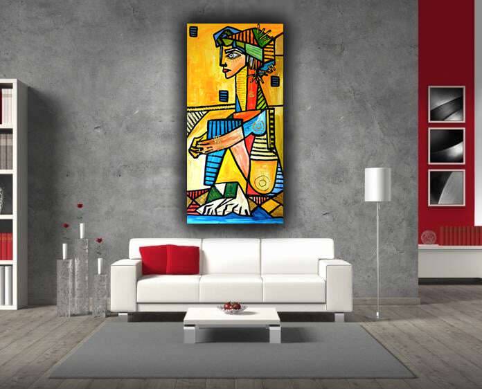 akryl na płycie malarskiej, format 82 na 40 centymetrów, boki zamalowane, gotowy do powieszenia, sygnowany.