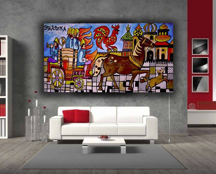 akryl na płótnie, format 140 na 77 centymetrów boki zamalowane, gotowy do powieszenia sygnowany