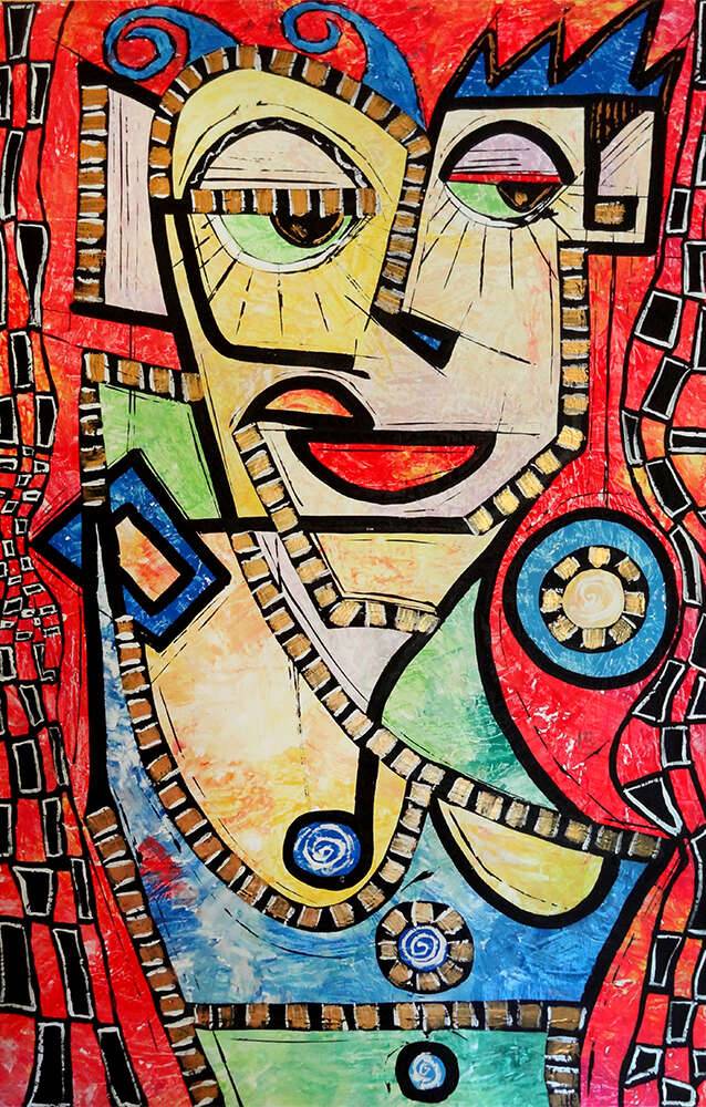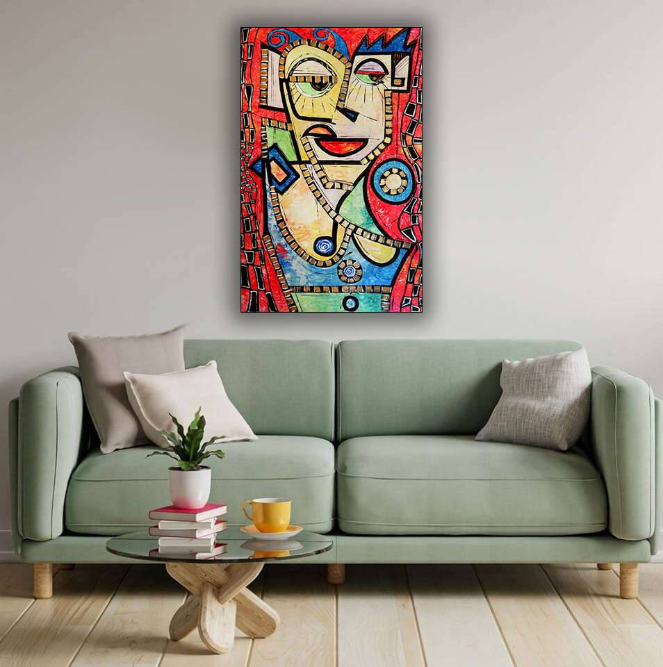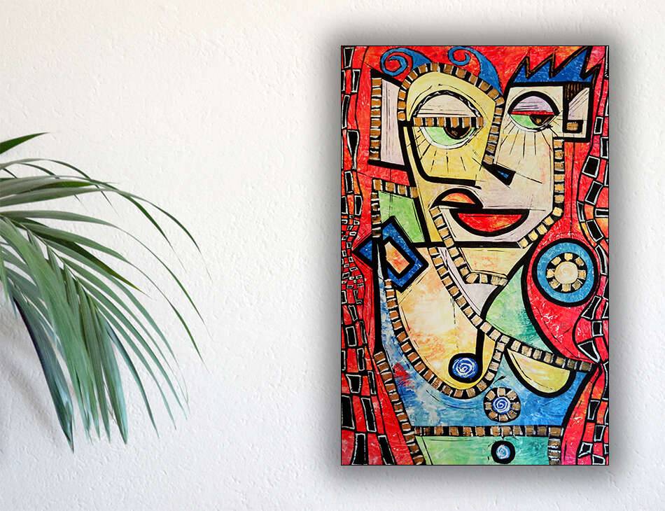 akryl na płycie malarskiej na ramie, format 84 na 53 centymetrów, boki zamalowane, gotowy do powieszenia, sygnowany.