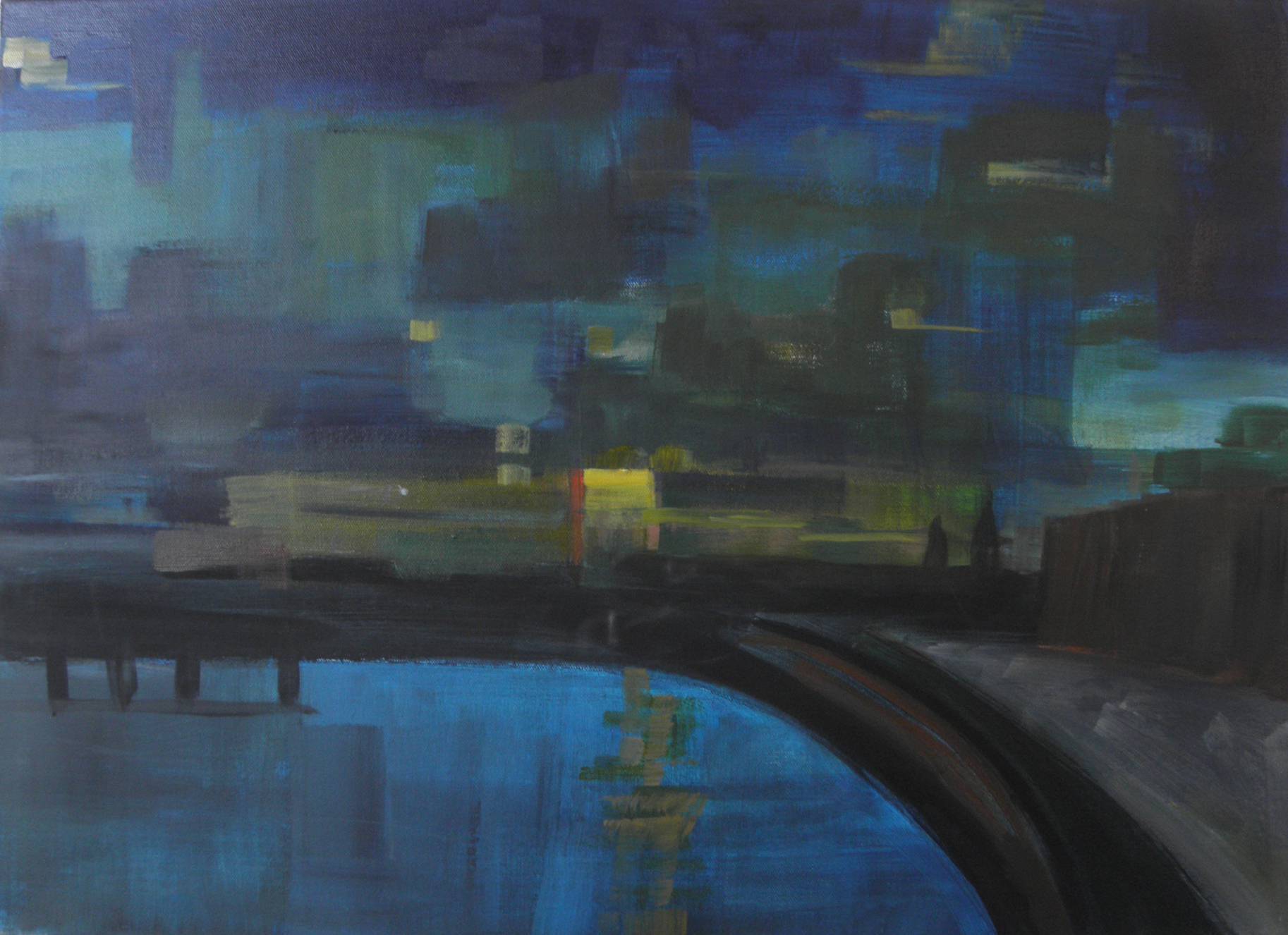 Na obrazie dominuje tajemnicza mieszanka ciemnych odcieni niebieskiego i zieleni, przeplatanych subtelnymi rozświetleniami. Kompozycja jest pełna dynamiki, jakby miasto ożywało nocą. Przemykające kształty budynków zderzają się z gładkością wody. Nastrój lekko melancholijny i nostalgiczny, jakby ukazywał moment refleksji czy tęsknoty. Styl artystyczny wskazuje na impresjonizm, może nieco abstrakcyjny. Pociągnięcia pędzla są szybkie, ekspresyjne, jakby artysta chciał uchwycić ulotność chwili. Dla mnie to obraz, który skłania do zatrzymania się na chwilę. Czuje się, jakby czas zwolnił. Czuję spokój i chęć zanurzenia się w tej chwili. Kolory są magiczne, almost unreal. Mogę sobie wyobrazić, że jest tu cicho, tylko szum wody rozbrzmiewa w tle. Może to miejsce, gdzie można się zgubić. Wywołuje emocje jak podczas czytania dobrej książki, kiedy odrywasz się od rzeczywistości. Można poczuć wewnętrzny spokój i ciekawość tego, co jest poza widocznym na obrazie. Deszczowy wieczór, pełen tajemnicy i uroku - prawdziwa uczta dla zmysłów. Mamo, to wygląda jak nocna bajka!