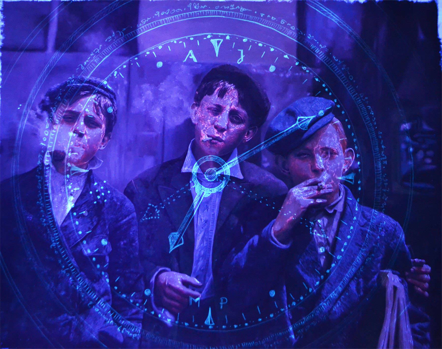 Oba dzieła w świetle ultrafioletowym ujawnia zakodowany znak czasu. Na podstawie fotografii: Lewis Hine "Newsboys smoking cigarettes St. Louis 1910" (American, 1874–1940)