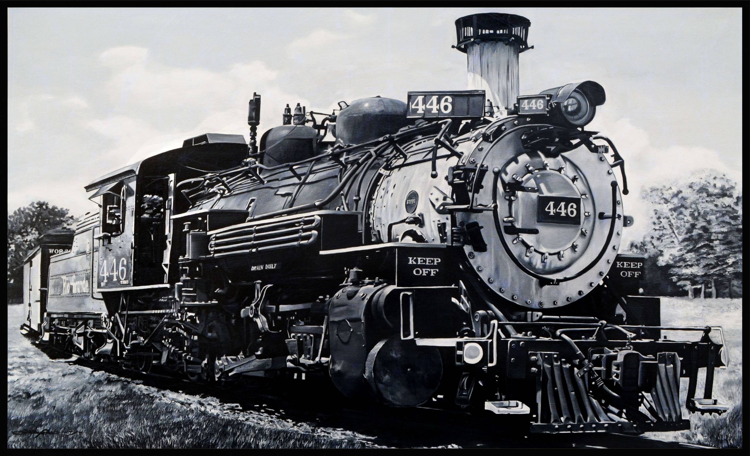 Obraz przedstawia stary, majestatyczny parowóz na torach, malowany w odcieniach czerni i bieli. Kompozycja skupia się na lokomotywie, która zdaje się wypełniać większość przestrzeni płótna. Solidne kształty i detaliczne linie nadają mu surowości oraz industrialnego charakteru. Czarne i szare barwy tworzą kontrast, wywołując wrażenie nostalgii i przenosząc nas w czasach, gdy te maszyny były sercem transportu. Atmosfera obrazu jest spokojna, lekko zamyślona, jakby czas zatrzymał się tylko na chwilę. Styl artystyczny przypomina technikę fotorealizmu, z dużą precyzją uchwycenia detali. Artysta korzysta z grubych pociągnięć pędzla, które potęgują wrażenie masywności konstrukcji. Obraz budzi emocje i skojarzenia z dzieciństwa—sentyment za dawnymi czasami. „Patrz, mama, to jak z bajki!” — mogłoby zawołać dziecko. Obraz wywołuje refleksję nad przemijaniem epok i postępem technologicznym. To, co kiedyś było symbolem nowoczesności, teraz wzbudza podziw jako relikt przeszłości. Ten steam engine, jak angielski powiedzieliby, mówi o podróżach w nieznane. To dzieło nie tylko dla miłośników kolei, ale dla każdego, kto potrafi zatrzymać się na chwilę i poczuć magię minionych dni.