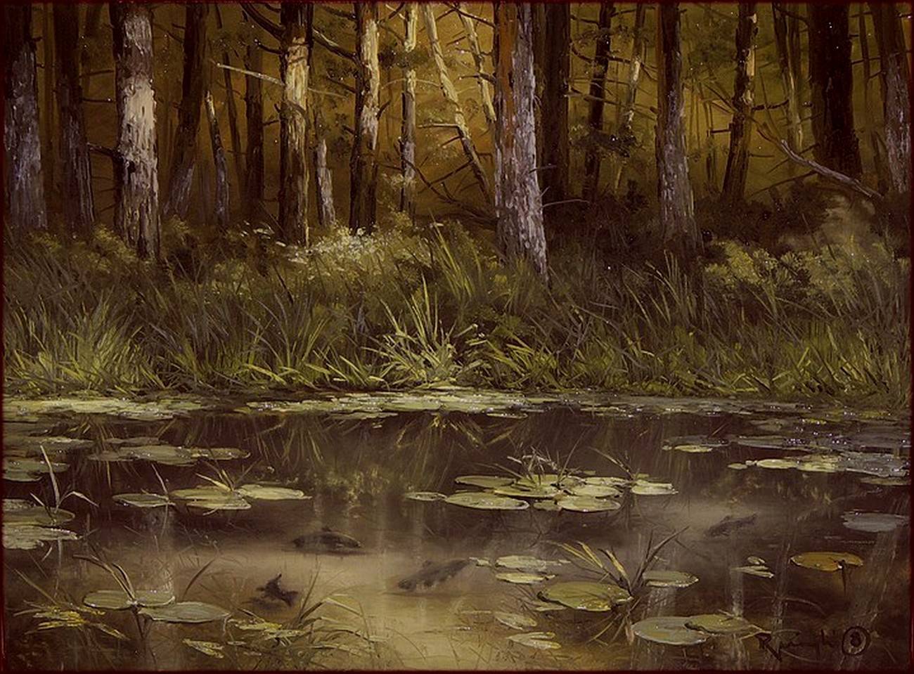 Na obrazie widzimy malowniczy las, który otacza spokojne jezioro porośnięte liliami wodnymi. Kolorystyka jest ciepła, dominują brązy i zielenie, które nadają kompozycji harmonii i naturalności. Woda odbija lekki połysk, dodając całości głębi i blasku. Drzewa w tle są majestatyczne, ich pnie są wyraźnie zarysowane na tle złotawego nieba. Atmosfera obrazu jest spokojna i nostalgiczna, jak gdyby czas zwolnił na moment. Artysta użył technik impastu, co widać w grubo nakładanej farbie oddającej teksturę trawy i drzew. Wszystko tu żyje, szepcze, delikatnie pachnie wilgocią lasu. Kto by nie chciał takiego widoku zza okna? To miejsce wygląda jak z magicznej bajki, gdzie każde dziecko marzy o bieganiu bosymi stopami. Obraz wywołuje uczucie spokoju, ale i lekkiego zadumania. Czy to miejsce naprawdę istnieje, czy tylko w naszej wyobraźni? Może to odrobina escapismu w codziennym zabieganiu. Dla mnie to takie "go-to" miejsce, gdzie mogę odpocząć myślami. I love it.