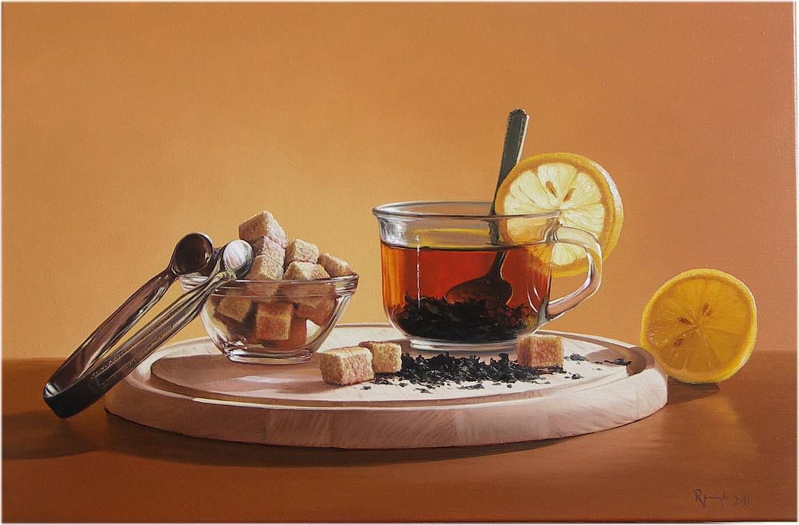 Na obrazie widzimy starannie skomponowaną martwą naturę, zdominowaną przez ciepłe, złote odcienie pomarańczowego tła. Na pierwszym planie znajduje się szklanka gorącej herbaty, w której połyskuje łyżeczka i plasterek cytryny dodaje jej świeżości. Obok spoczywa mniej zaparzonej herbaty, co wprowadza element nieładu, ale takiego, który zachęca do chwili relaksu i reflect. Niezwykle realistycznie odwzorowane sześciany cukru dają wrażenie, że można je niemal dotknąć. Atmosfera obrazu jest przyjemnie ciepła, a zarazem intymna i nostalgiczna. Artysta użył techniki hiperrealizmu, oddając najdrobniejsze szczegóły światła i cienia. Widz może poczuć spokój i harmonię płynącą z codziennych momentów, takich jak picie ulubionej herbaty. Emocje, które budzi obraz, są miłe i kojące. Czujesz się jak w miłym zakątku, gdzie czas płynie wolniej. Obraz ten może wzbudzać pragnienie prostoty i odnalezienia radości w małych rzeczach. Wow, ale fajny obrazek, powiedziałoby dziecko. Równocześnie, ten niesamowity detal i ciepło kolorów mogą w widzu wywołać głębokie poczucie odprężenia. To taki moment, kiedy myślisz, I need this.