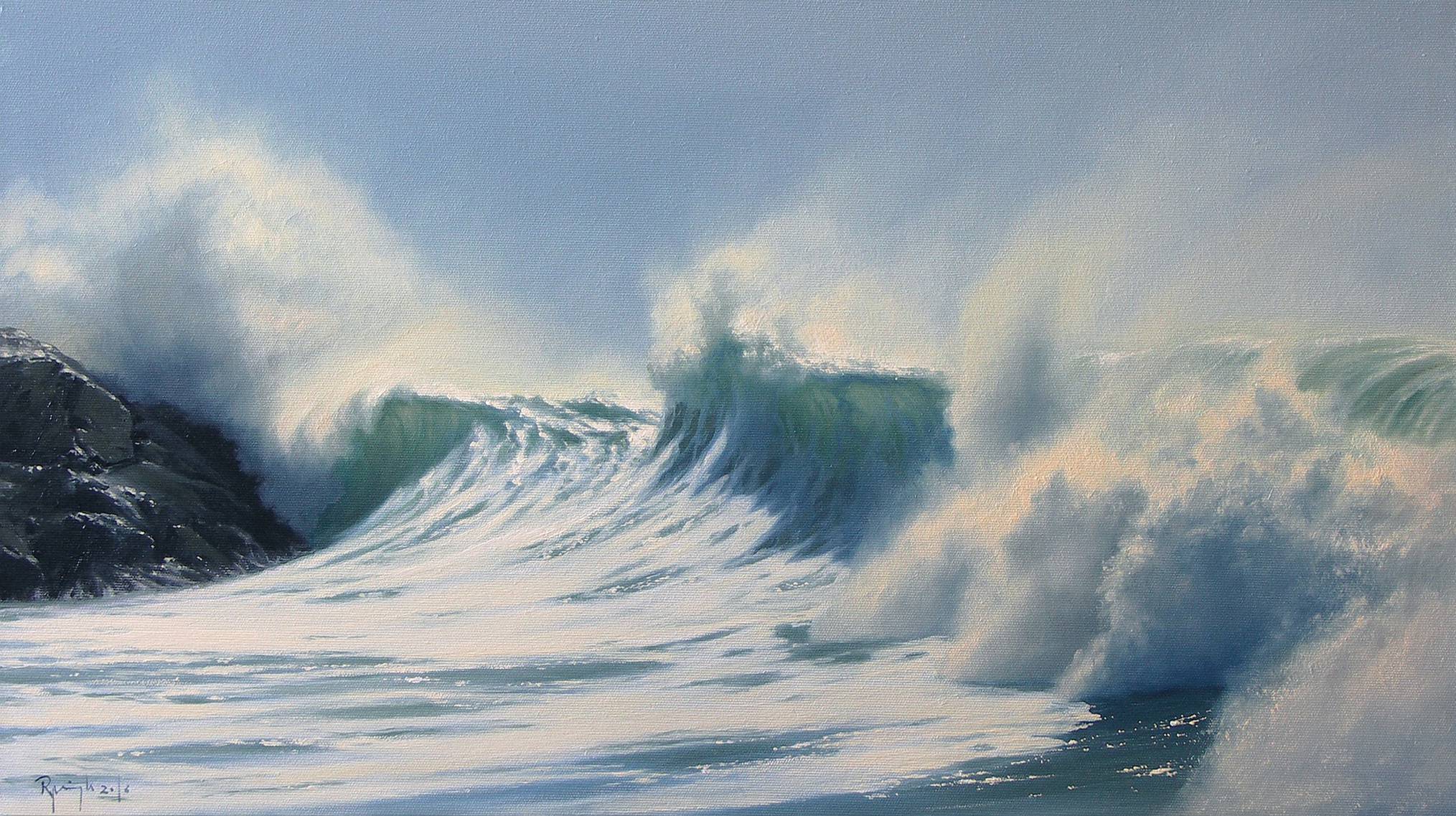 Obraz przedstawia majestatyczne fale morskie, uderzające z impetem o skaliste wybrzeże po lewej stronie. Kolory są stonowane, dominują odcienie niebieskiego i biel, które doskonale oddają dynamikę i energię morskiego żywiołu. Kompozycja dzieła skupia się na ruchu fal, które zdają się tańczyć w powietrzu, unosząc się i opadając z elegancją. Atmosfera obrazu jest pełna energii, niemal słychać szum i ryczący huk oceanu. Artystę cechuje realistyczny styl i precyzyjna technika, dzięki której fale wyglądają tak, jakby zaraz miały ochlapać widza. To prawdziwe "wow" dla oka. Ślady pędzla są subtelne, a gra światła dodaje głębi i intensywności scenie. Ten obraz to emocjonalna podróż, która może wywoływać uczucie zachwytu, a jednocześnie lekkiego niepokoju przed siłą natury. Kiedy patrzysz na ten obraz, możesz poczuć się jak dziecko biegające po plaży. "Patrz, jak duże fale!" Też macie wrażenie, jakbyście tam byli? Fale uderzają nadając scenie monumentalny charakter, a ja myślę sobie: jak dobrze, że dziś nie muszę walczyć z takim oceanem. Fascynujące, prawda? Dla mnie to istny rollercoaster emocji.