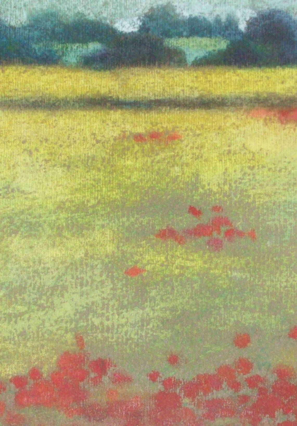 Na obrazie dominują ciepłe, pastelowe barwy, głównie zielenie i żółcie, które przechodzą w nasycone czerwienie na pierwszym planie. Kompozycja jest prosta, a delikatność kształtów sprawia, że całość wygląda jak marzenie. Horyzont rozmywa się delikatnie w tle, ukazując zarys drzew, sprawiając wrażenie wymarzonego krajobrazu. Obraz emanuje spokojem i sielanką, taką, którą można poczuć podczas leniwego popołudnia na łące. Technika, której użył artysta, to prawdopodobnie pastel, która pozwala na płynne przechodzenie kolorów i subtelne cieniowanie. Czuć w tym dziele lekkość oraz impresjonistyczny touch, gdzie rzeczywistość jest przefiltrowana przez emocje. Przyglądając się temu obrazowi, można poczuć nostalgię za beztroskimi chwilami dzieciństwa. "Wow, ile tam kwiatków!" powiedziałoby zachwycone dziecko. Jest w tym coś magicznego, co sprawia, że serce bije szybciej. Ten artwork przyciąga uwagę i zaprasza do własnej interpretacji, pobudzając wyobraźnię do tworzenia osobistych opowieści.