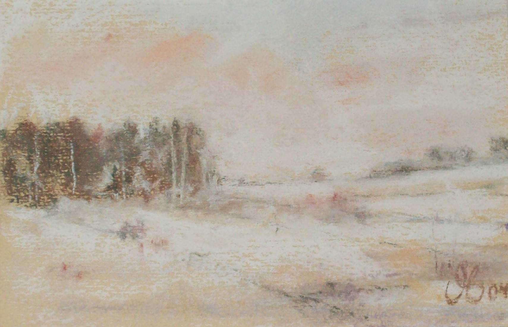 Na obrazie dominuje subtelna paleta pastelowych barw, z lekkimi brązami, różem i beżami. Dominujący punkt to grupa drzew, które stoją na granicy mgły. Ich sylwetki z ledwością wyróżniają się na tle delikatnej poświaty. Obraz emanuje spokojem i melancholią, jakby czas zatrzymał się na chwilę przed zachodem słońca. W stylu obrazu można dostrzec wpływy impresjonizmu, z delikatnymi muśnięciami pędzlem, które oddają ulotność chwili. Artysta zastosował technikę rozmycia, co sprawia, że krajobraz wydaje się odrobinę niewyraźny, jak w marzeniu. Patrząc na to dzieło, można poczuć chłodny powiew wiatru i zapach wilgoci unoszącej się w powietrzu. Jest w nim coś nostalgic, przypomina chwile, kiedy człowiek tęskni za czymś nieuchwytnym. "To wygląda jak z bajki!" – pomyślałby 7-latek, próbując objąć wzrokiem całość. Obraz budzi refleksję o ulotności i przemijaniu, ukazując chwilę zatrzymaną w czasie. Przyciąga wzrok i nie pozwala oderwać się od niego, jakby zachęcał do zanurzenia się w jego ciszy.