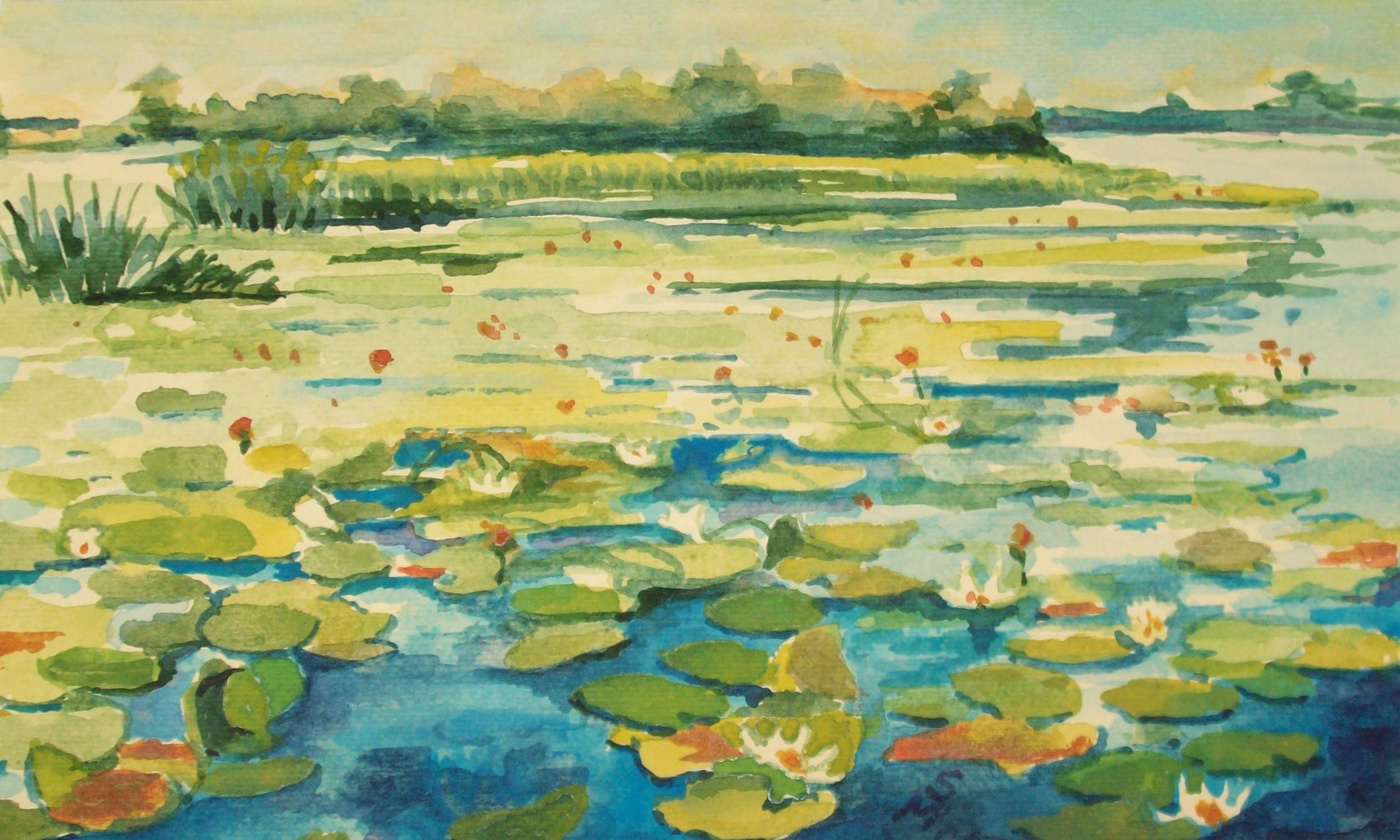 Na obrazku widzimy spokojną scenę wodną przypominającą letnie popołudnie, pełne ciepłych kolorów. Dominują różne odcienie zieleni przeplatające się z nieskazitelnym błękitem nieba i wody. Liliowe liście pokrywają powierzchnię, a drobne, białe kwiaty rozpraszają się jak kropki tu i tam. Kompozycja jest delikatna, niemal ulotna, z rozmytymi konturami, co dodaje jej senny charakter. Obraz emanuje spokojem i harmonią. Wydaje się, że artysta zastosował technikę akwareli, co widać po delikatnych przejściach kolorów i przezroczystości poszczególnych warstw. Taki styl przekazuje uczucie lekkości i subtelności. Widz może poczuć, jakby niemal odpływał na liściach lilii, dryfując z nurtem przyrody. Obraz wywołuje uczucie wewnętrznego spokoju, tęsknoty za chwilą wytchnienia. Wygląda jak spełnione marzenie o idyllicznym miejscu, gdzie czas płynie wolniej. Może to być też forma ucieczki od codzienności, jak mały secret world, gdzie każdy może znaleźć chwilę odprężenia. W głowie od razu nasuwa się myśl: "Chcę tam być!" Myślę, że obraz to swego rodzaju medytacja w kolorach i formach. Mój brat powiedziałby pewnie: „Tam jest dużo liści i kwiatków na wodzie!” i miałby rację. To dzieło to nie tylko widok, to cała opowieść zamknięta w spokojnych tonach. Fascynuje mnie, jak niewiele elementów potrafi przekazać tak wiele emocji.
