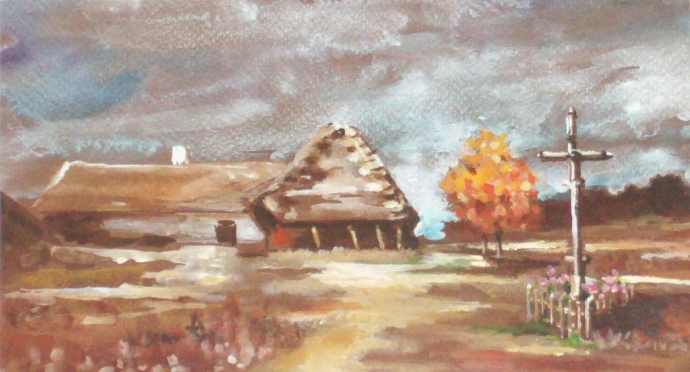Obraz przedstawia nostalgiczny wiejski pejzaż. Na pierwszym planie widzimy krzyż otoczony skromnym płotkiem z kolorowymi, pastelowymi kwiatami. Po prawej stronie, nieco w tle, widać barwnie ubraną drzewo z jaskrawymi liśćmi, które przemykają się w kolorze pomarańczowym i żółtym. Dominuje kompozycja w odcieniach brązu i beżu, z ciężkimi szaro-niebieskimi chmurami na niebie. Technika akwareli dodaje dziełu delikatności, rozmywa kontury i dostarcza poczucie ulotności chwili. Atmosfera jest nieco melancholijna, przypominająca o przemijaniu, ale jednocześnie tchnie spokojem. Takie landszafty często wywołują uczucie zadumy i refleksji nad prostotą życia na wsi. Ten obraz mówi: "Cisza to new black". Może wywoływać u odbiorcy poczucie spokoju, a jednocześnie intensywne tęsknoty za przeszłością. Takie miejsce jak na tym obrazku to jak z bajki! Obecność krzyża dodaje mu duchowego wymiaru, stając się świadkiem codziennych ludzkich trosk i radości.